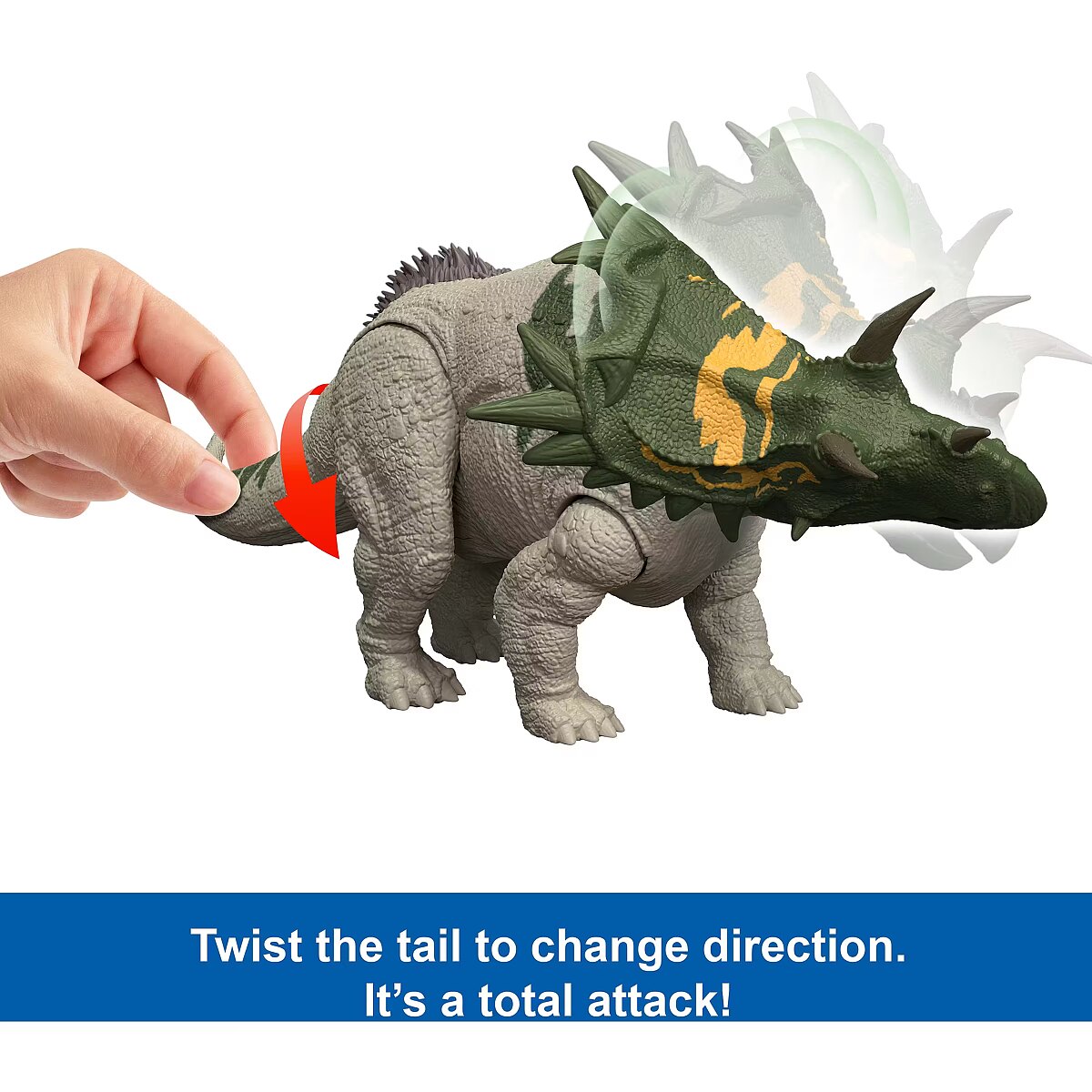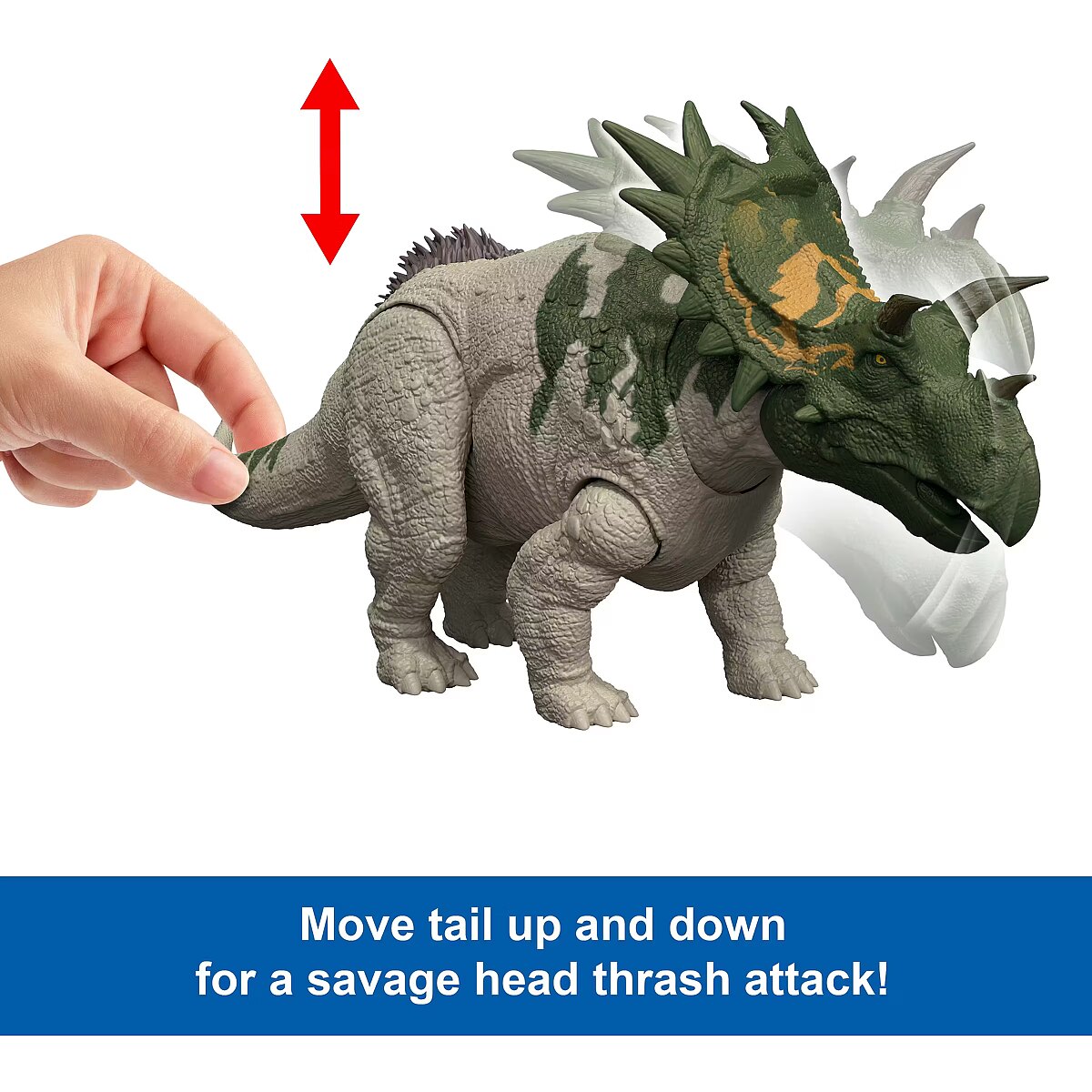 LongDesc - Get roaring and ferocious with this Wild Roar Spiclypeus inspired by Jurassic World Rebirth. It's a Total Attack kids can easily move the tail up and down on this dinosaur toy to activate a thrilling up and down head butt attack, accompanied by a savage roar, then twist the tail to change the direction to side to side! This 11-inch long movie-inspired figure has movable joints, ready for exciting battle play or dramatic display. Scan the Tracking Code on the dinosaur's foot in the free Jurassic World Play App with a compatible smart device (Android or iOS, not included) to unlock a digital version of the dinosaur and play the fiercely fun game to race various vehicles on land, air and sea. The Spiclypeus is suitable for dinosaur fans ages 4 years and older. Colours and decorations may vary.