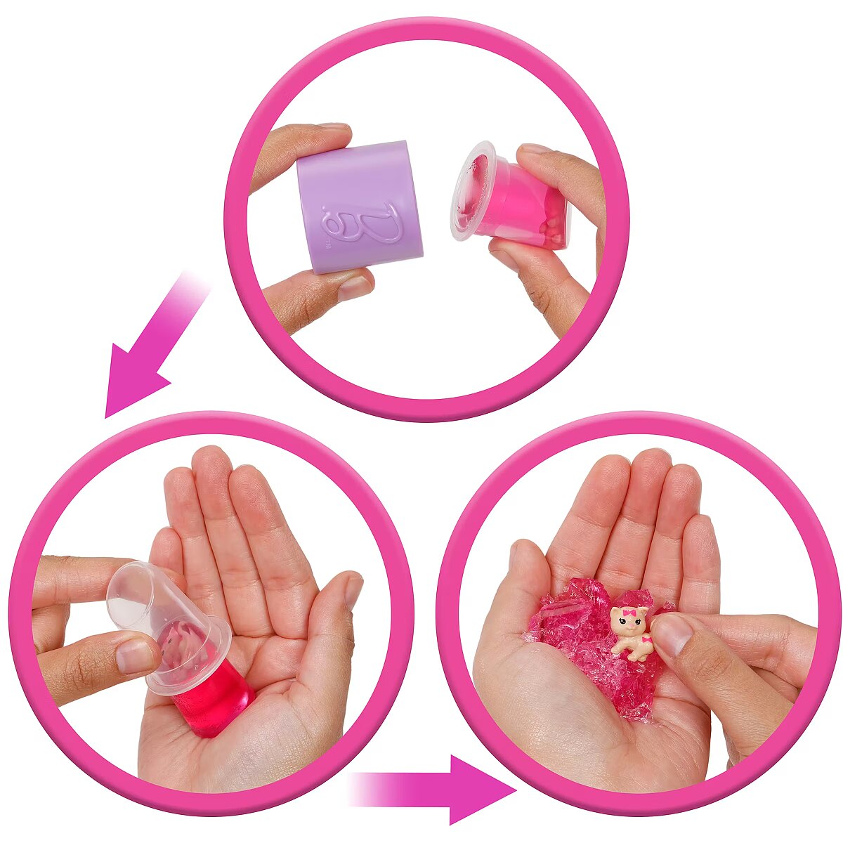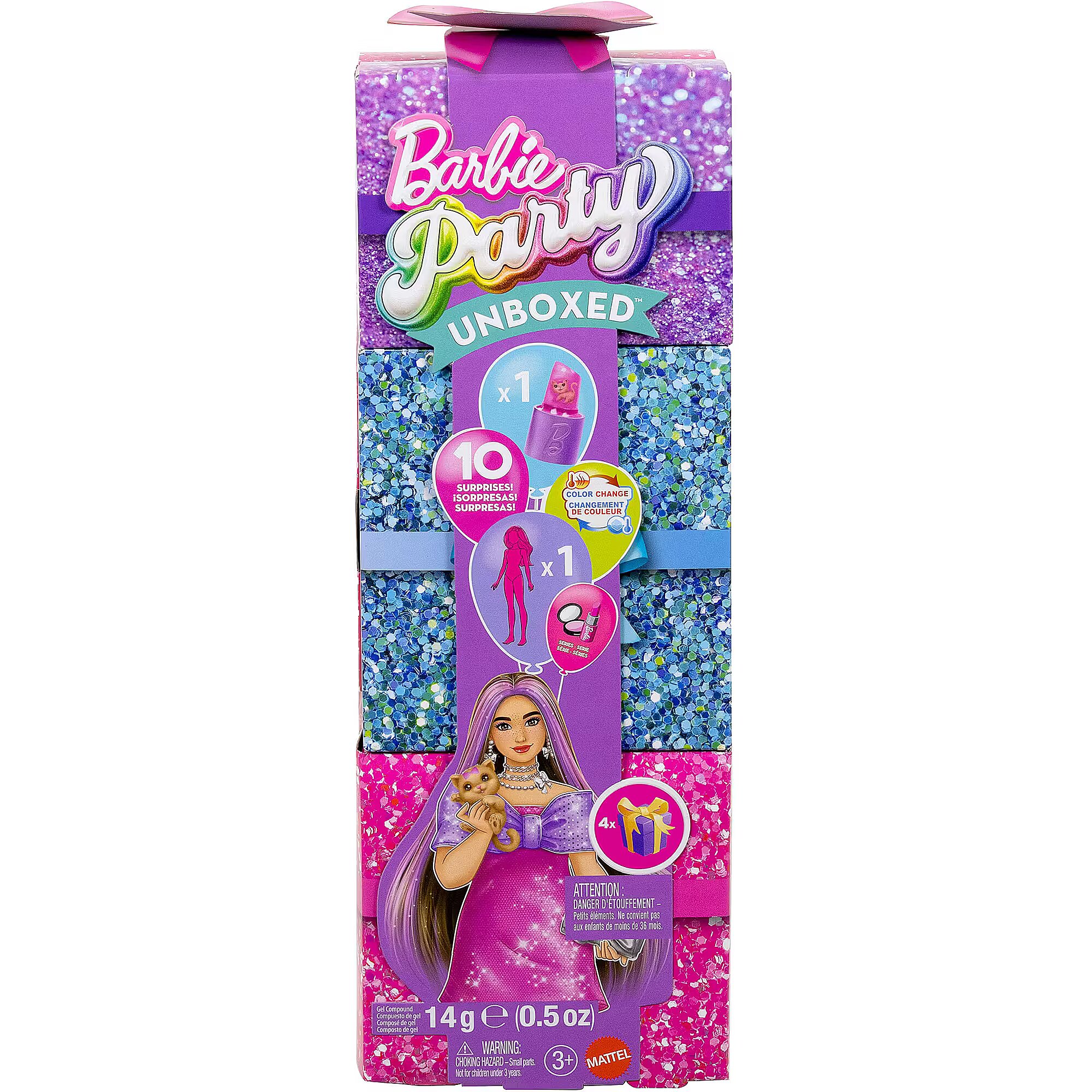 LongDesc - With 10 surprises in one package, Barbie Party Unboxed Glam Party series dolls deliver a fun unboxing experience with gift box-inspired packaging and glam-themed fun! Start 'unboxing' to find a Barbie fashion doll, then remove her hair towel and face mask. Which will you unbox? There are three to collect, each with a unique look. Keep unboxing to find more surprises hidden in a compact. Use the included brush to 'poke' each section of the compact and uncover surprise accessories for Barbie doll! Next, discover a lipstick-inspired tube with jelly Slime inside -- crush the jelly Slime to find the pet friend! Finally, reverse Barbie doll's towel to reveal a fun party dress and add her accessories to get party-ready. More surprises include colour-change on the doll's face and hair -- simply use icy cold and warm water to transform, change back, and repeat again and again! Kids will love discovering surprises to help Barbie doll get party-ready and can collect all the Barbie Party Unboxed dolls to keep the fun going! Each doll sold separately, subject to availability. Dolls cannot stand alone. Colours and decorations may vary.