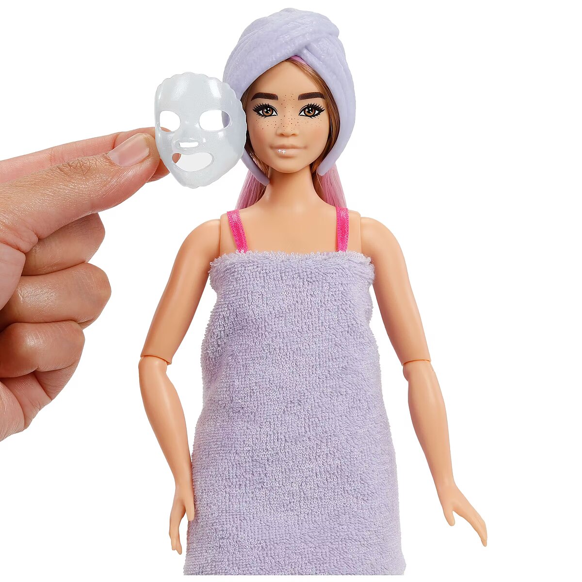 Packaging content - Packaging content - ​Includes Barbie fashion doll with 2 colour-change features wearing 1 reversible towel, 1 hair towel, and 1 face mask, plus 1 beauty compact with 1 necklace, 1 purse, 1 pair of earrings, 1 pair of shoes, 1 dress bow, 1 mini makeup palette, 1 tube with jelly Slime, and 1 pet.