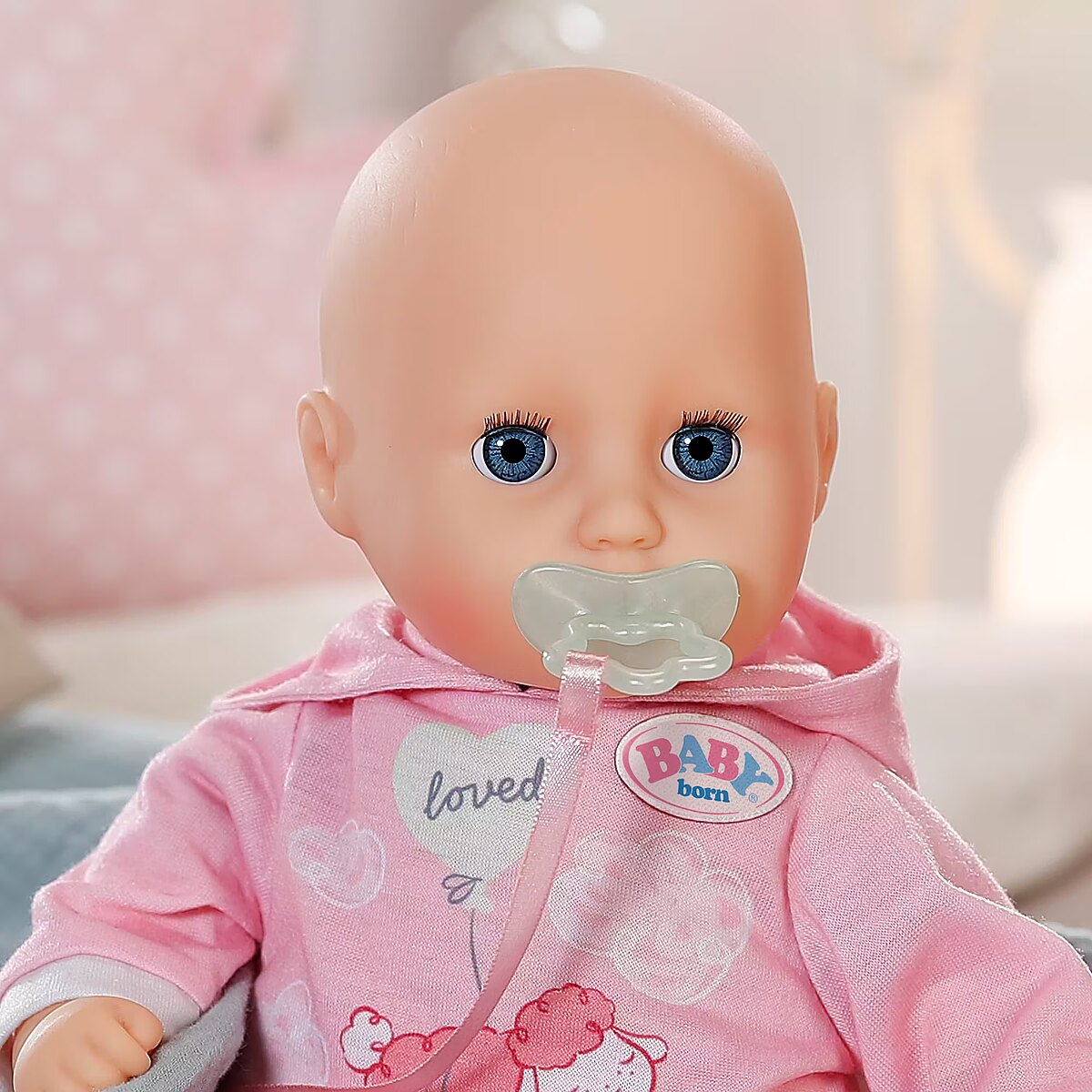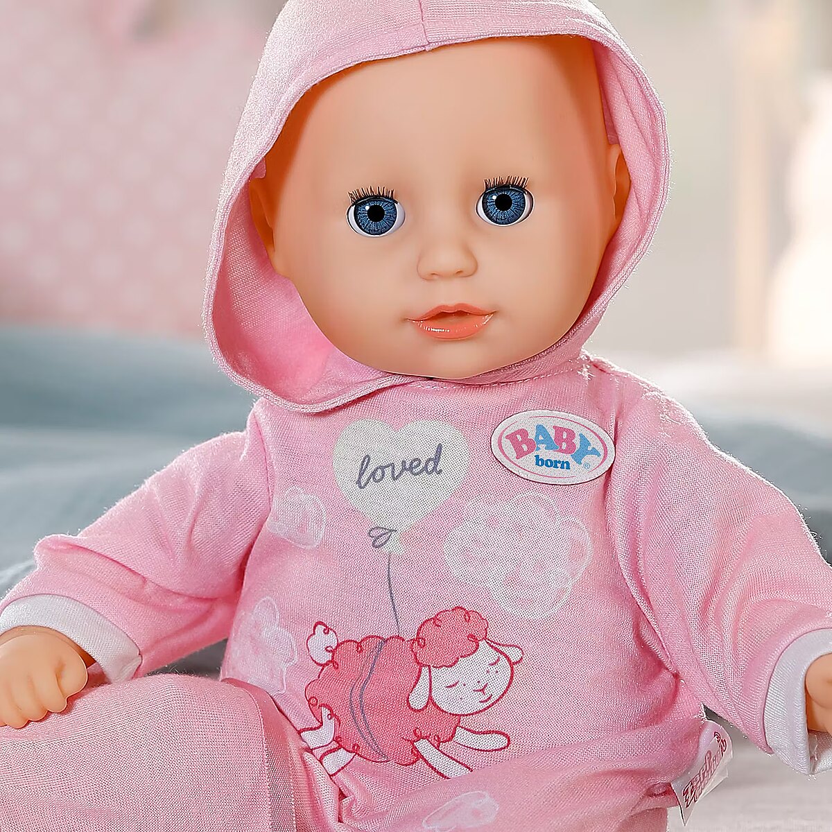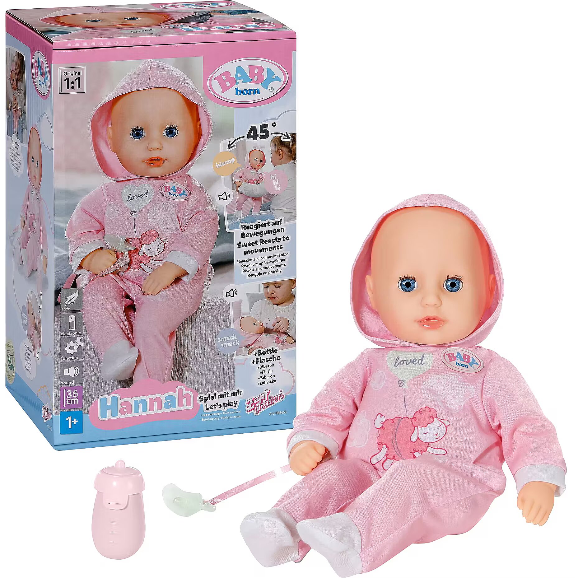 LongDesc - BABY born Hannah Play with me is suitable for children aged 1 year and over thanks to her soft fabric body and 36cm height. Hannah's play principle is child's play. She reacts to every movement and interaction: If you hold her bottle to her mouth, she makes cute sucking noises, if you gently press her tummy, she announces with an "egg yes" that she feels good. If you tilt her to the left and right, she gives a little hiccup and a cheerful laugh. If you put Hannah to sleep after extensive play, she closes her eyes, breathes softly and finally falls asleep. She has her bottle, dummy and a casual hooded romper with her. Thanks to the easy handling, Hannah's small size and her simple play principle, even the youngest children can look after their baby doll.