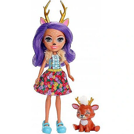 LongDesc - Let the adorable Enchantimals dolls and their animal friends enchant you. Danessa Deer doll shares a special bond with Sprint deer -- they're always together, and they look alike, too! A nurturer at heart, Danessa Deer doll (6-inch) wears a sweet outfit with lovely flower patterns and furry detail. Little ones will adore her long purple hair and enchanting details that match her animal-bestie, like a-doe-able antlers and deer ears. Sprint deer has charming touches, too, like matching antlers and a patch of furry white hair. Kids will love playing out the special bond these two friends share and creating their own Enchantimals adventures! Collect them all to build out your whimsical world of Enchantimals (each sold separately, subject to availability). Includes doll wearing fashion and accessories and animal figure. Colours and decorations may vary.
