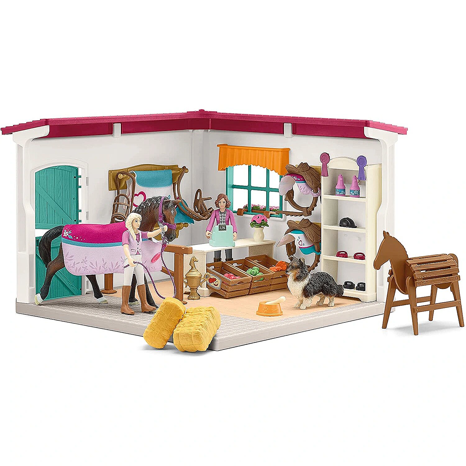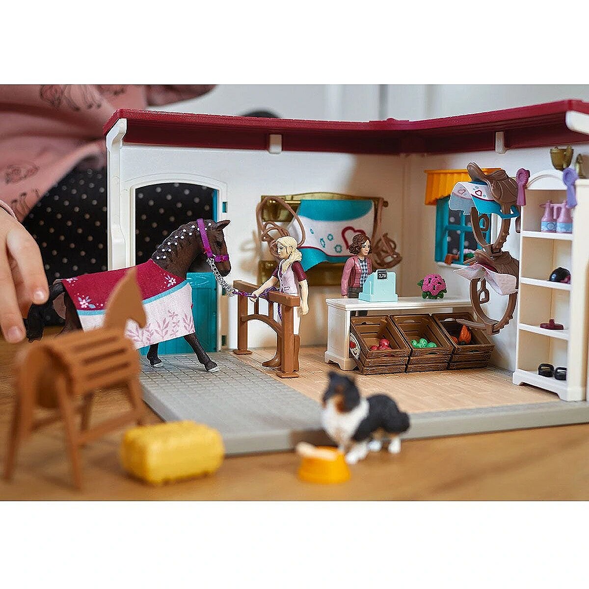 LongDesc - Ding-dong! Customers are arriving at the schleich® HORSE CLUB riding store. What special treat will you pick up for your horse? Horse feed, saddles, brushes...this tack store has everything! There's even a friendly dog to help you find what you need. Load up your pack, then it's time to head back to the stables...sorry, you can't escape your stable chores by shopping all day.