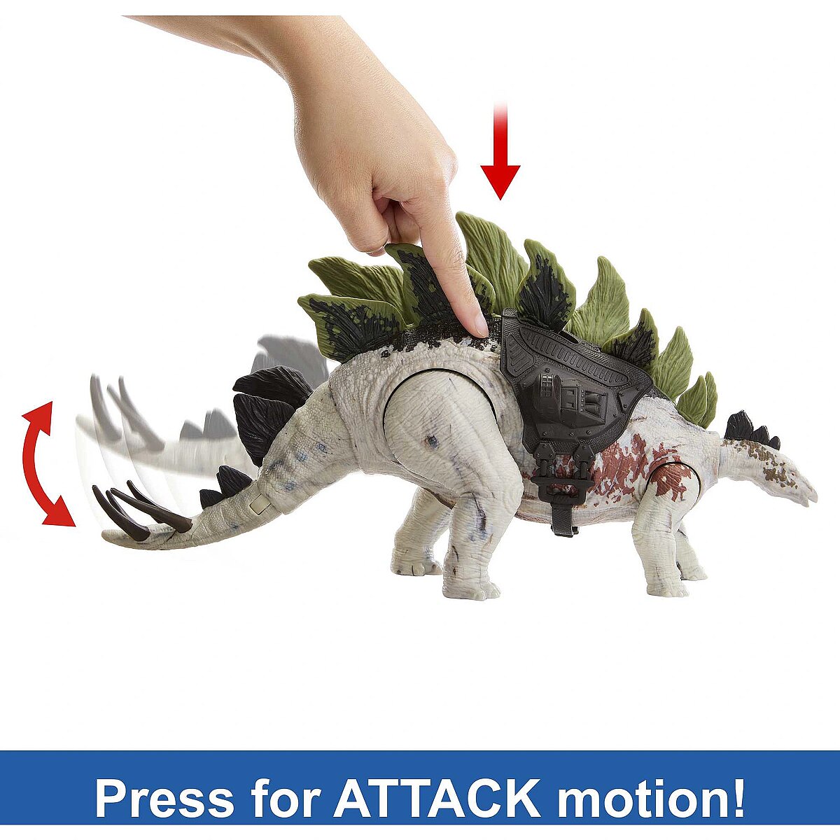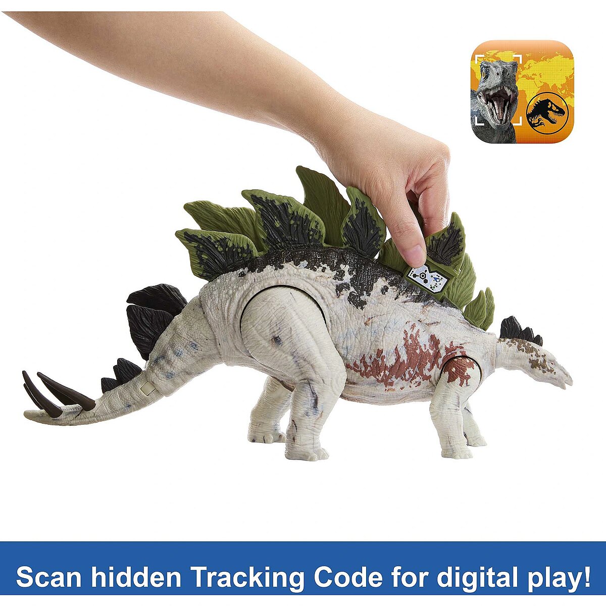 LongDesc - This Jurassic World Dominion Gigantic Tracker Stegosaurus figure has 2 attack motions and removable tracking gear! This authentic figure has extended range of motion in the attack actions for realistic battle play. Makes a great gift for dinosaur fans ages 4 years and up. Bring the dinosaur 'TO LIFE' using Augmented Reality! Scan the hidden Tracking Code in the free Jurassic World Facts App with a compatible smart device (Android or iOS, not included) to unlock AR experiences and games! Colours and decorations may vary.