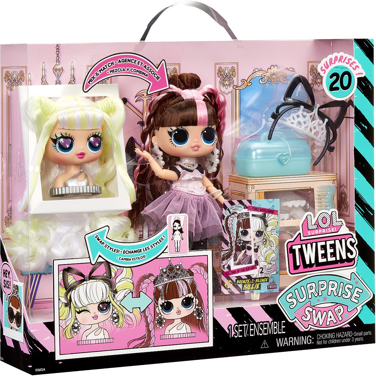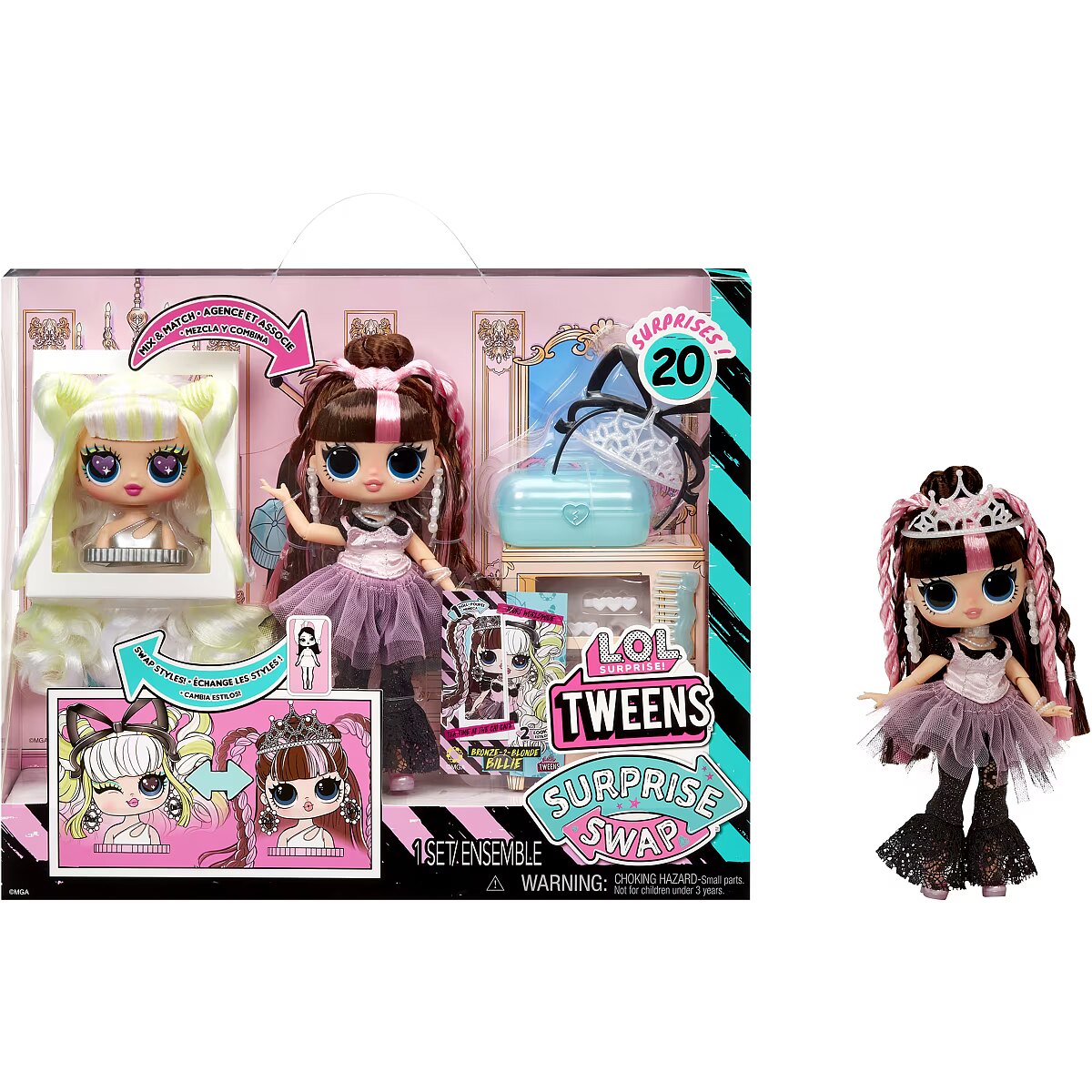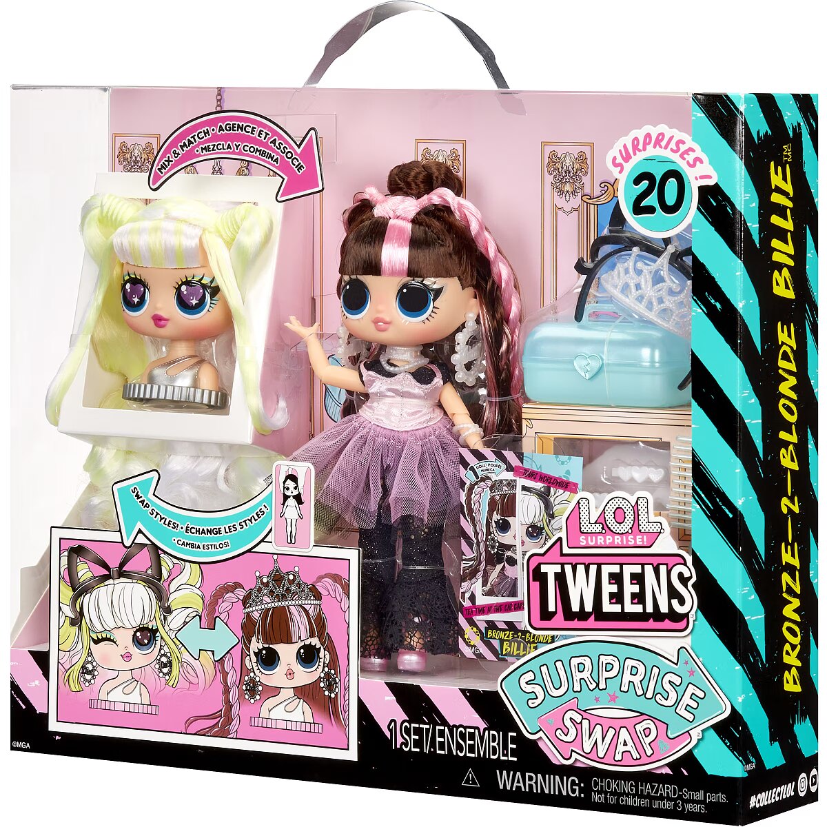 LongDesc - I’m in Be Tween, but right where I wanna be. Full of surprises & unique style. Look out world, cuz here I come.Introducing the all-new L.O.L. Surprise Tweens Surprise Swap™ Fashion Doll Bronze-2-Blonde Billie who comes with 2 unique looks and a swappable styling head for the ultimate customization and hair play experience! As a cat café enthusiast, Billie is making the most of her worldwide tour by visiting various cafes where she loves to chat with her BFFs while sipping her favorite teas. Unbox 20+ surprises including a styling head, fabulous fashions, shoes, a caboodle, a tiara, a pearl bracelet, hair styling accessories, a hairbrush, a doll stand, and more! Change Billie’s look in an instant by swapping out her brown and pink hairstyle with the styling head with blonde highlights that can easily be attached to the doll’s body. Next, give her a quick outfit change and switch up her accessories including her headpiece, hair accessories, and more! Once you finish styling your doll, repeat the head swapping feature and accessory changes over and over again to create endless mix-and-match looks! Pair the Tweens Surprise Swap™ dolls with the eye-catching new Surprise Swap Styling Heads that each come with gorgeous hair and hair accessories for even more customization! Each doll has stunning features, beautiful hair, her own glamorous style, and comes articulated for tons of posing opportunities. Accessories can be neatly stored in the adorable caboodle and the additional styling head can always be placed back on the head stand when not in use for easier clean up. Collect all 4 L.O.L. Surprise Tweens Surprise Swap™ fashion dolls: Braids-2-Waves Winnie, Bronze-2-Blonde Billie, Buns-2-Braids Bailey, and Curls-2-Crimps Cora.