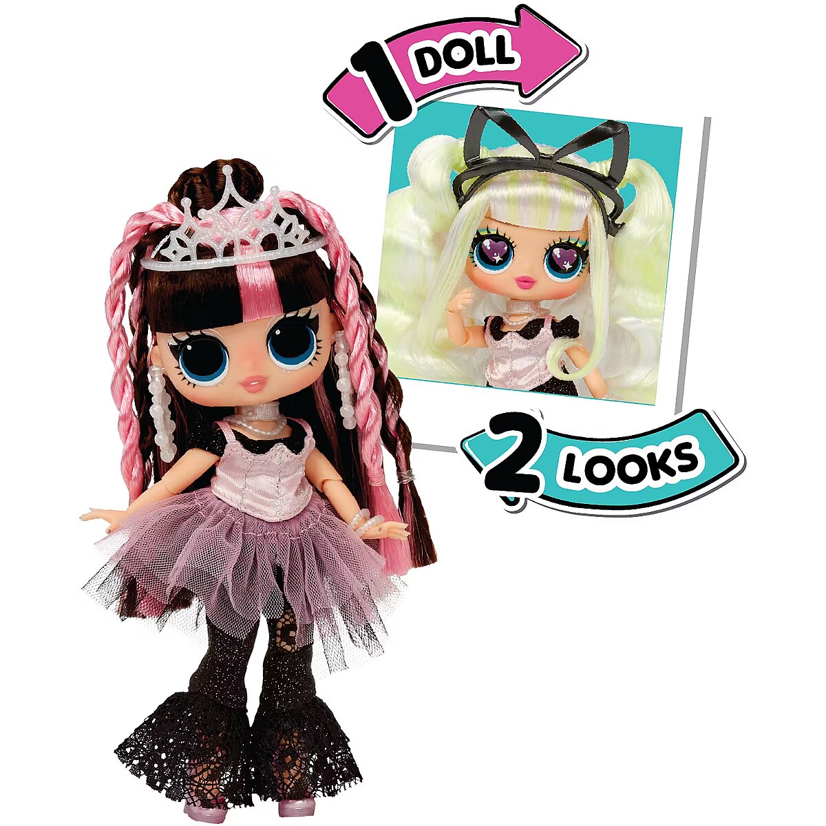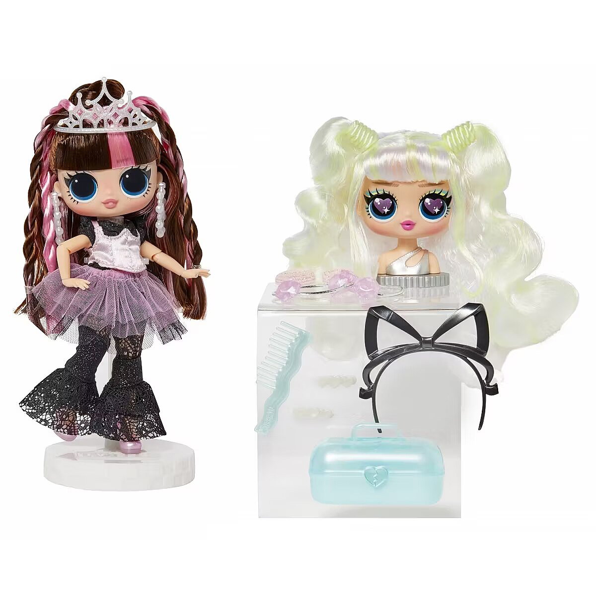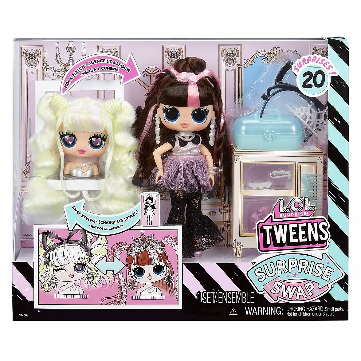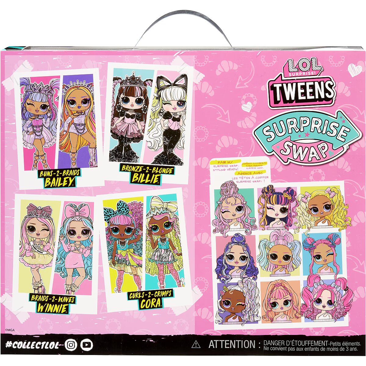 LongDesc - I’m in Be Tween, but right where I wanna be. Full of surprises & unique style. Look out world, cuz here I come.Introducing the all-new L.O.L. Surprise Tweens Surprise Swap™ Fashion Doll Bronze-2-Blonde Billie who comes with 2 unique looks and a swappable styling head for the ultimate customization and hair play experience! As a cat café enthusiast, Billie is making the most of her worldwide tour by visiting various cafes where she loves to chat with her BFFs while sipping her favorite teas. Unbox 20+ surprises including a styling head, fabulous fashions, shoes, a caboodle, a tiara, a pearl bracelet, hair styling accessories, a hairbrush, a doll stand, and more! Change Billie’s look in an instant by swapping out her brown and pink hairstyle with the styling head with blonde highlights that can easily be attached to the doll’s body. Next, give her a quick outfit change and switch up her accessories including her headpiece, hair accessories, and more! Once you finish styling your doll, repeat the head swapping feature and accessory changes over and over again to create endless mix-and-match looks! Pair the Tweens Surprise Swap™ dolls with the eye-catching new Surprise Swap Styling Heads that each come with gorgeous hair and hair accessories for even more customization! Each doll has stunning features, beautiful hair, her own glamorous style, and comes articulated for tons of posing opportunities. Accessories can be neatly stored in the adorable caboodle and the additional styling head can always be placed back on the head stand when not in use for easier clean up. Collect all 4 L.O.L. Surprise Tweens Surprise Swap™ fashion dolls: Braids-2-Waves Winnie, Bronze-2-Blonde Billie, Buns-2-Braids Bailey, and Curls-2-Crimps Cora.