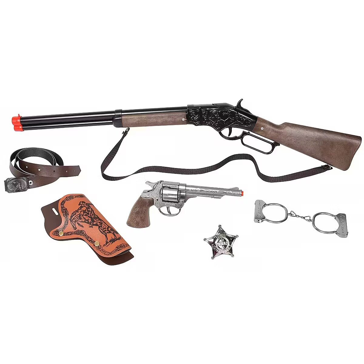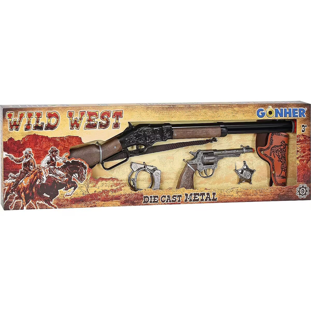 Description - Gonher cowboy set Set includes metal cowboy rifle, metal revolver with drum, sheriff's badge, handcuffs and holster.