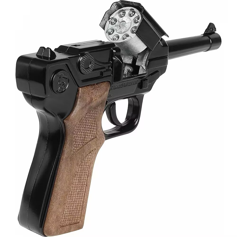 Description - Metal police pistol for 8 cartridges with drum.
