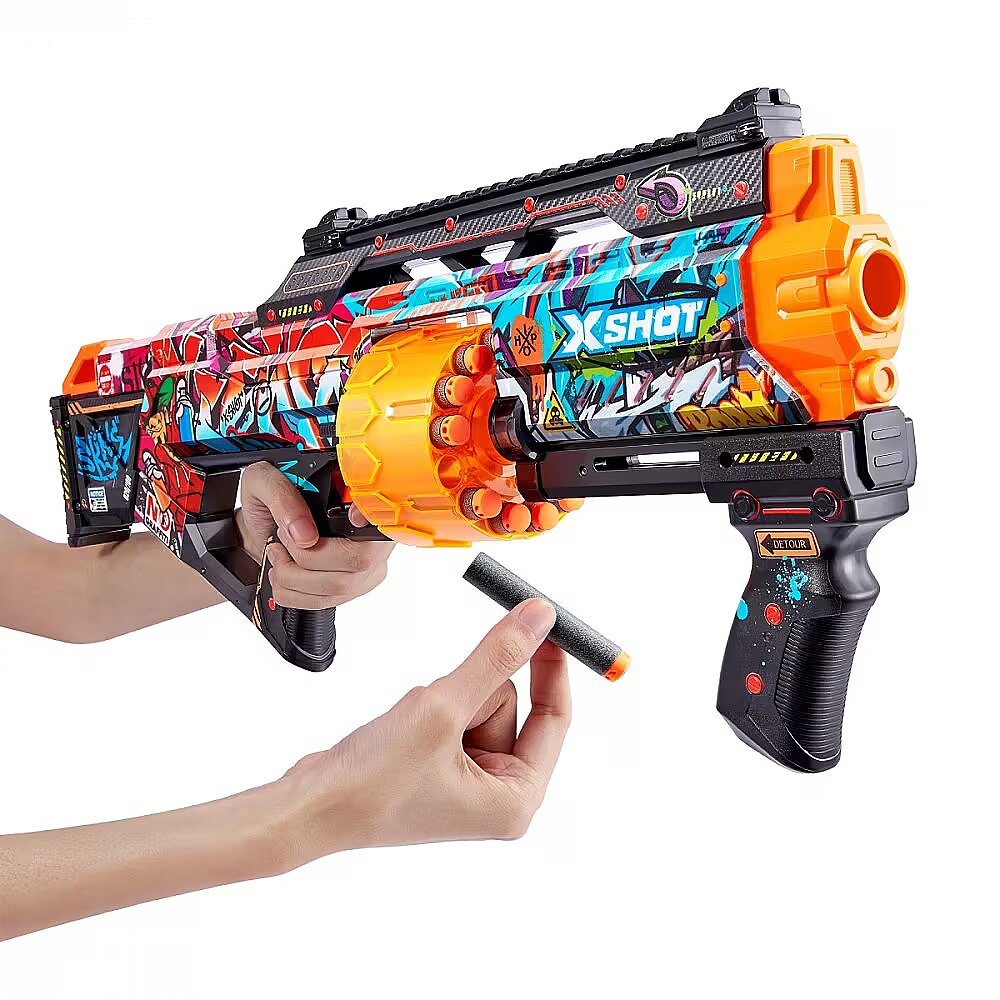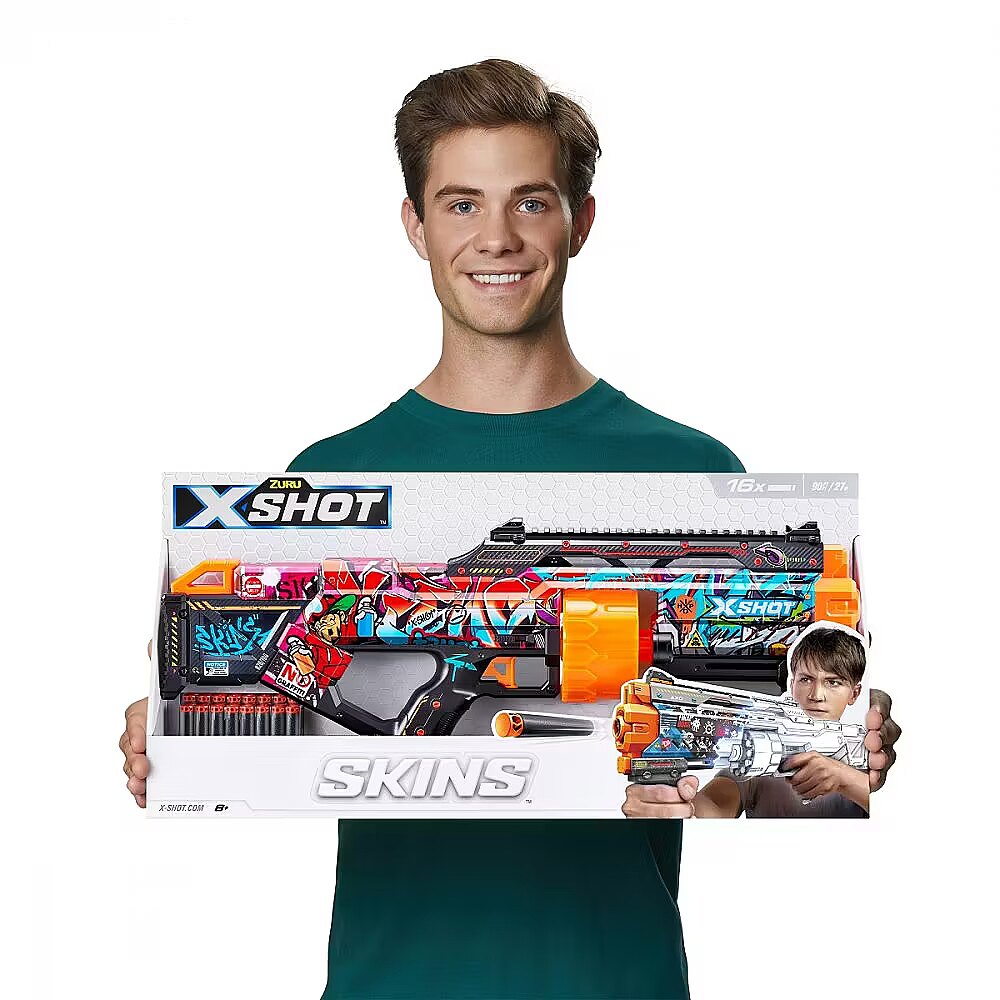 Description - X-Shot Skins Last Stand Dart Blaster Last Stand Graffiti X-Shot Skins brings the in-game experience of skinning your blaster into the real world, choose your Skin and join the battle. The X-Shot Skins Last Stand is the largest blaster in the Skins range, combining epic fire power, speed in action and accuracy all in one blaster. With a 14-dart capacity auto-rotating barrel you can hit multiple targets up to 27m / 90 feet away. Unleash 14 darts in seconds thanks to its easy-to-prime mechanism. The Last Stand comes with a tactical grip and rail for easy loading and allows you to add accessories to your blaster to level up. X-Shot Skins darts include new air pocket technology for a faster, further, and more accurate shot. The X-Shot Skins Last Stand blaster comes in 4 unique skins to select and collect. Choose different, choose X-Shot Skins. Choose your Skin: Using a new state of the art printing technology, X-Shot Skins is the first custom designed blaster that brings the in-game experience of skinning your blaster to the battlefield. The X-Shot Skins Last Stand comes in 4 unique skins to select and collect. Choose different, choose X-Shot Skins. Firing Power: The Last Stand is the largest blaster in the X-Shot Skins range and comes packed with a punch! Hit multiple targets up to 27m / 90 feet away. Dart Capacity: The X-Shot Skins Last Stand has a 14-dart capacity auto-rotating barrel. Unleash all 14 darts in seconds with its easy-to-prime and slam fire mechanism. Air Pocket Technology: X-Shot Skins include new and improved Air Pocket Technology Darts for a further, faster, and more accurate shot! Pack Inclusions: 1x X-Shot Skins Last Stand Blaster 16x Air Pocket Technology Foam Darts