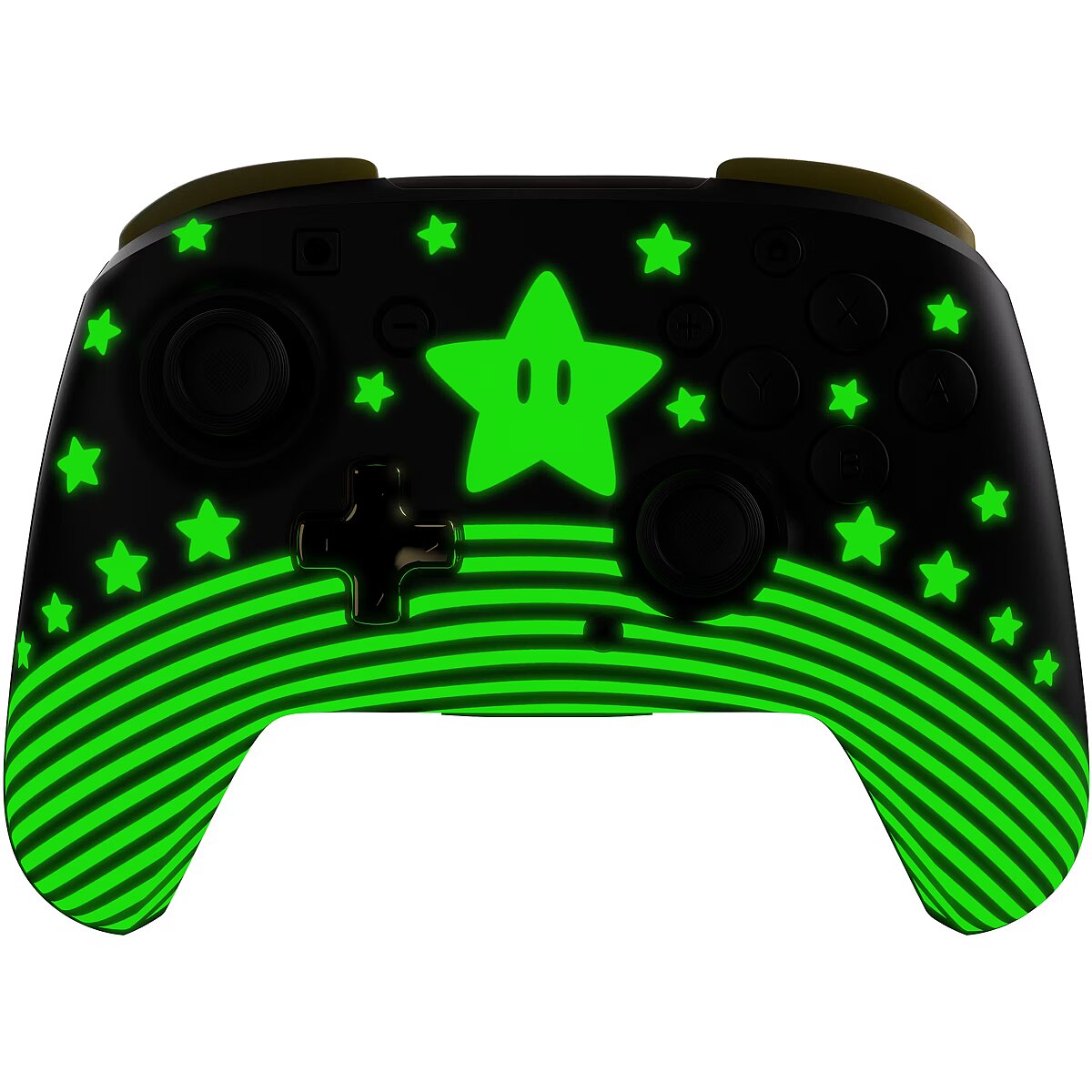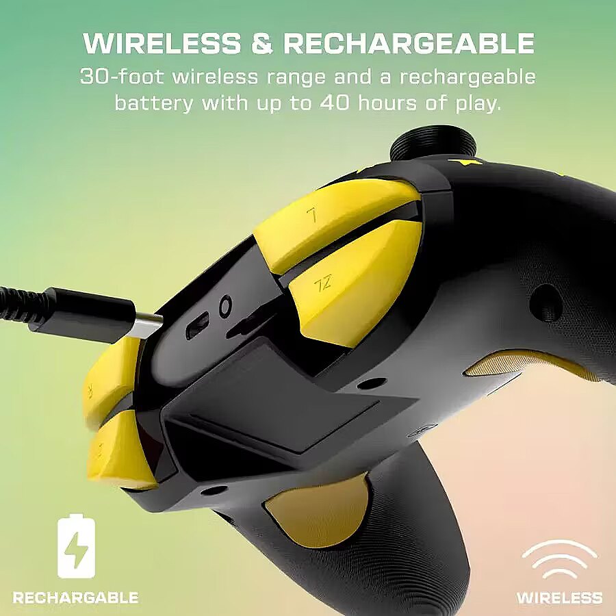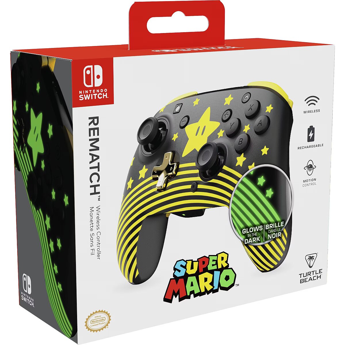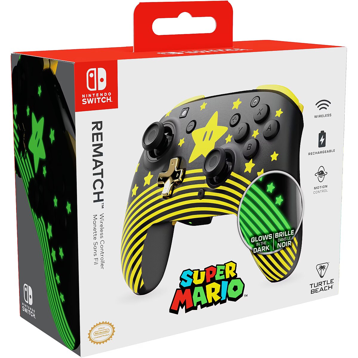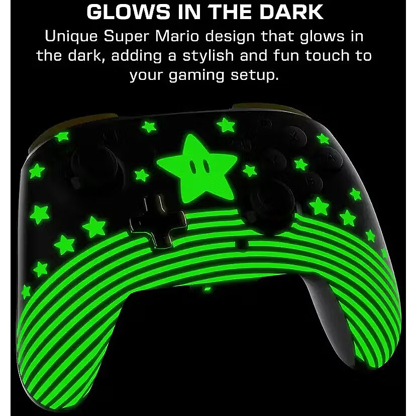 LongDesc - Supercharge your gaming sessions with the Super Mario Star Rematch Wireless Controller on Nintendo Switch, Nintendo Switch Lite, and Nintendo Switch - OLED Model. This controller also works with Nintendo Switch 2 – C Button not available. Brighten up the darkest of gaming rooms with a glow-in-the-dark design after exposure to UV light. For long gaming sessions, you will appreciate the rechargeable battery providing up to 40 hours of play and up to 30-foot wireless range so you can play comfortably from anywhere in the room. Play with natural precision using built-in motion controls in games like Mario Kart 8, and new games like Mario Kart World and Donkey Kong Bananza. With bold style, responsive features, and a glow-in-the-dark design, the officially licensed Rematch Wireless Controller for Nintendo is ready for your next adventure.
