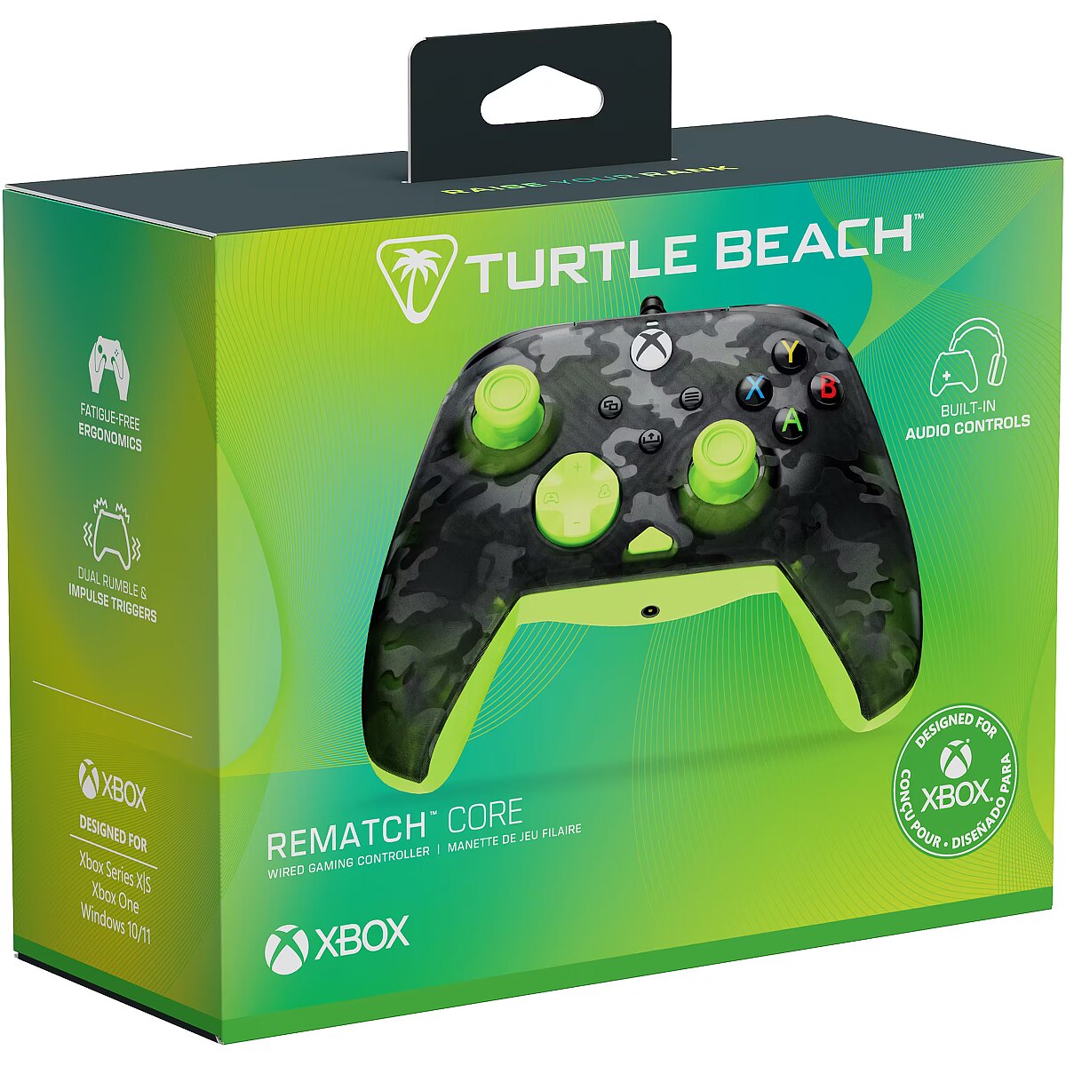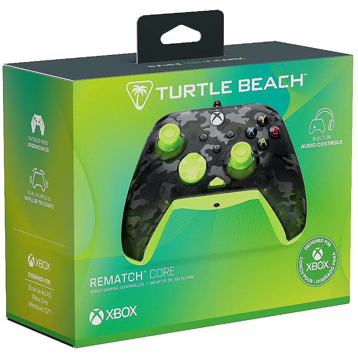 LongSummaryDescription - Turtle Beach Rematch Core Yellow and Ghost Black Camo Wired Gaming Controller with Audio Controls, Rumble Motors and Impulse Triggers – Licensed for Xbox Series X or S, Xbox One and Windows PCs. Device type: Gamepad, Gaming platforms supported: PC, Xbox, Xbox One, Xbox Series S, Xbox Series X, Gaming control function buttons: D-pad, Options button. Connectivity technology: Wired, Device interface: USB, USB connector type: USB Type-C. Product colour: Black, Grey, Yellow, Cable length: 2.5 m. Power source: Cable. Windows operating systems supported: Windows 10, Windows 11