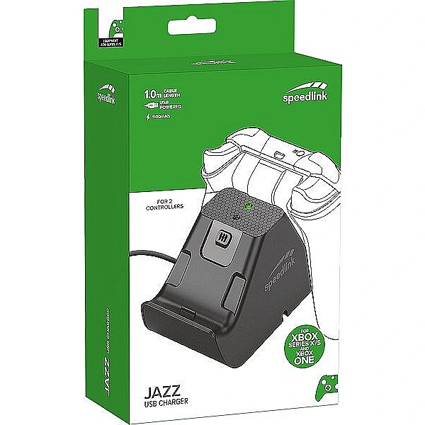 description_en - The Jazz USB Charger will charge your wireless gamepads for Xbox Series X® and S quickly and reliably. The compact charging station is powered directly by the console or any other USB port (at least 500mA) – such as on your PC or notebook. The device can charge up to two controllers at the same time, and will keep them securely in place. Charging station for original controllers for Xbox Series X®, S and Xbox One® Stable standing Convenient clip-on system Charge via the console or any USB port Simultaneously charge up to two controllers 2 battery packs and 4 battery flaps for Series X/S and One Detachable Micro-USB charging cable Status LEDs Cable length: 1.5m