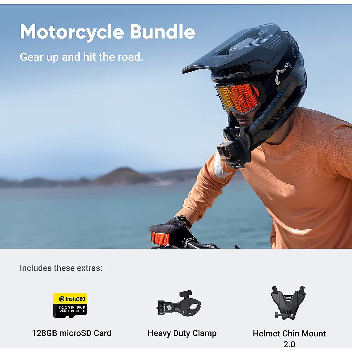 Üks võte, mis tahes perspektiiv. Jäädvusta vabadusega eksportida mis tahes kuvasuhtega. Jaga sotsiaalmeedias nii horisontaalses kui ka vertikaalses vormingus, et igast klipist maksimaalselt kasu saada! Loovus ilma piiranguteta TimeShift. Kiirenda aega ja ruumi. Starlapse. Jäädvusta öötaevast vapustavate täheradadega. Timelapse. Vaata elu kiirendatud vaates. AI Selfie Stick Eraser. Eemaldab sekunditega käsistatiivi lõppkaadrist. AI Warp. Lisa oma videotele dünaamiline pöördeefekt, kasutades kvaliteetseid ja kohandatavaid AI efekte, mida saab rakendada kogu klipile või kindlatele osadele. Motorcycle Bundle komplekti kuulub: Insta360 Ace Pro 2