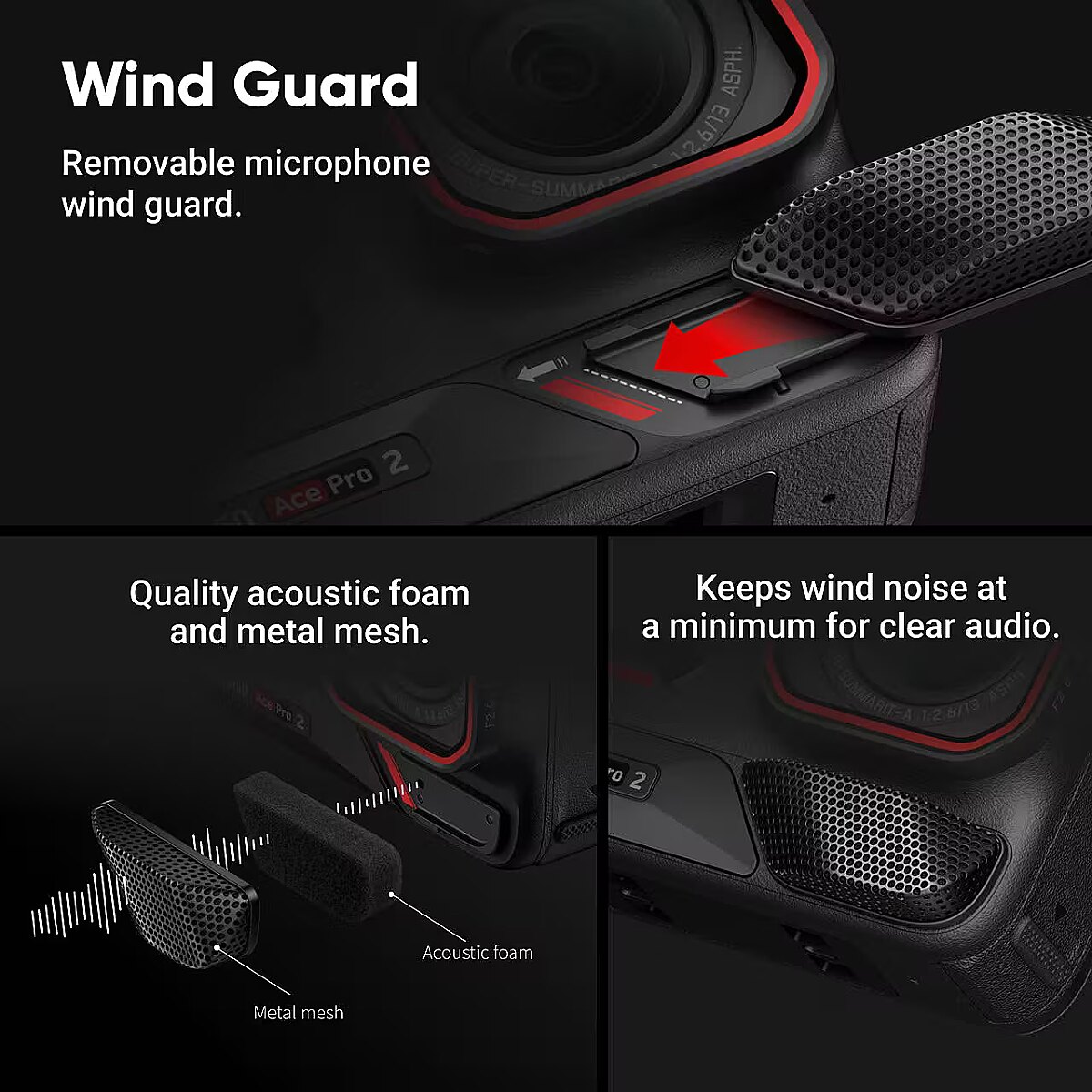 Ace Pro 2 on esimene integreeritud tuulekaitsega seikluskaamera. Uuendusliku disainiga hoiab see tipphetkedel müra minimaalsena, olles valmis vajadusel sisse- ja väljalülitamiseks. Täiustatud helialgoritmid