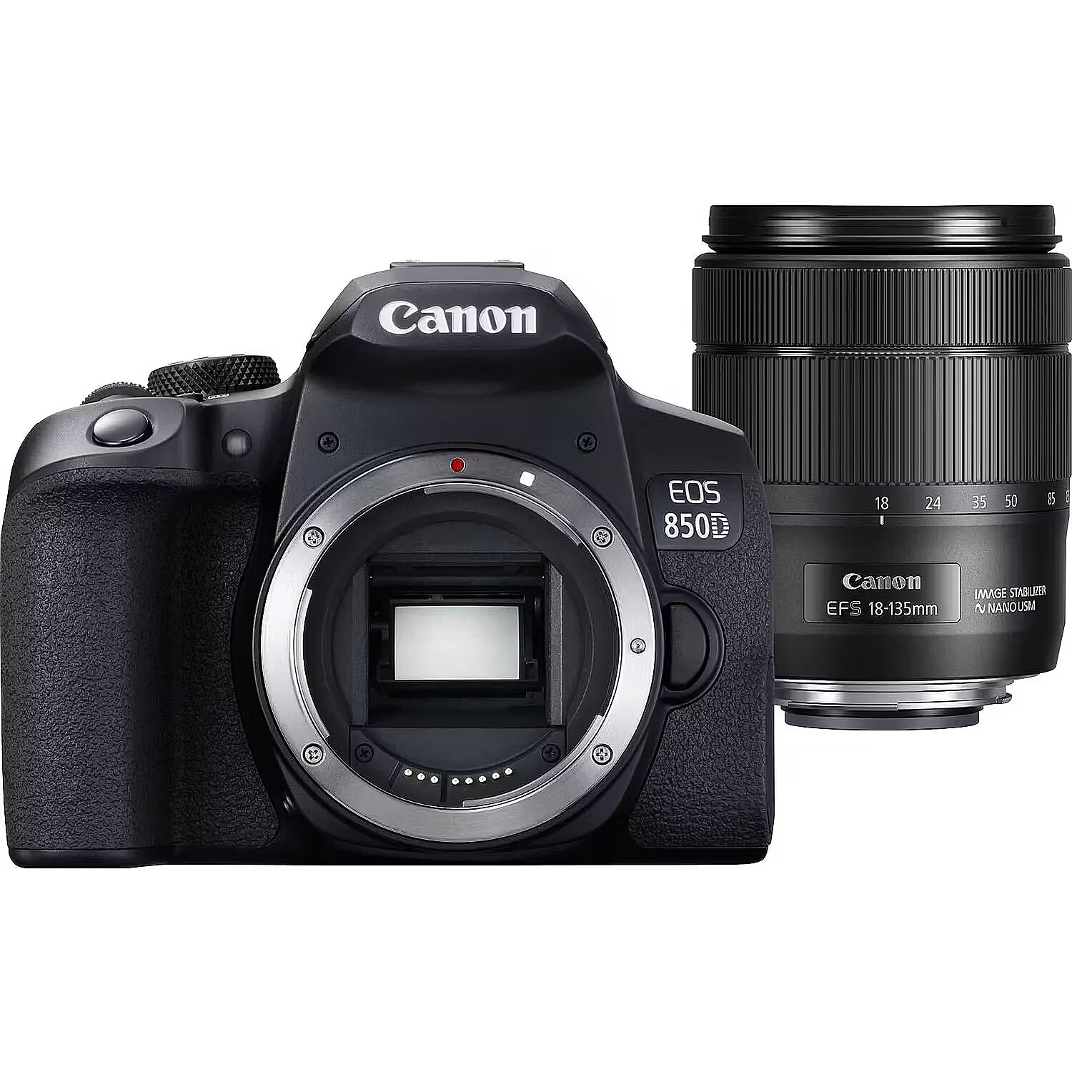 LongSummaryDescription - Canon EOS 850D. Camera type: SLR Camera Kit, Megapixel (approx.): 24.1 MP, Sensor type: CMOS, Maximum image resolution: 6000 x 4000 pixels. ISO sensitivity (max): 25600. Focal length range: 18 - 135 mm. Fastest camera shutter speed: 1/4000 s. Wi-Fi. HD type: 4K Ultra HD, Maximum video resolution: 3840 x 2160 pixels. Display diagonal: 7.62 cm (3"), Touchscreen. Viewfinder type: Optical, Pentamirror. PictBridge. Product colour: Black