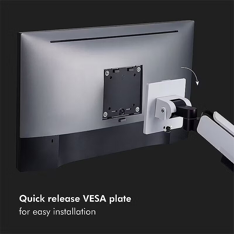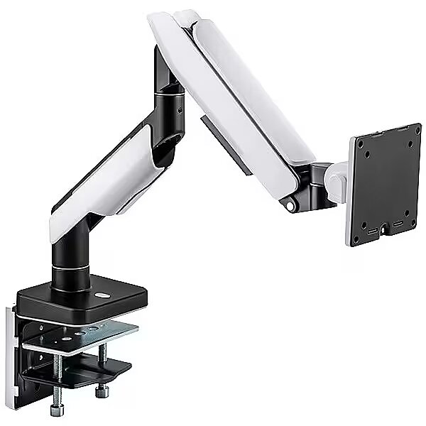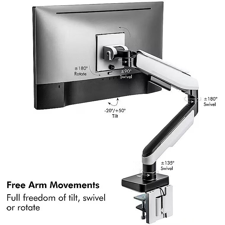 Other features - Suitable for 1749" monitors Number of monitors: 1 Mounting type: Table clamp or grommet mounting Weight capacity: 20 kg max. Maximum arm length: 458 mm Tilt: -20°/+50°, swivel: -90°/+90°, front panel rotatable: 360° Dimensions front panel WxH: 116x116 mm VESA compatibility: 75x75, 100x100 Features a heavy-duty and spring-assisted swing arm for steady movement Optimized tilting structure provide smoother adjustment for large screen Built-in lighting effect Cable management: Elegantly hides all cables connected to the monitor