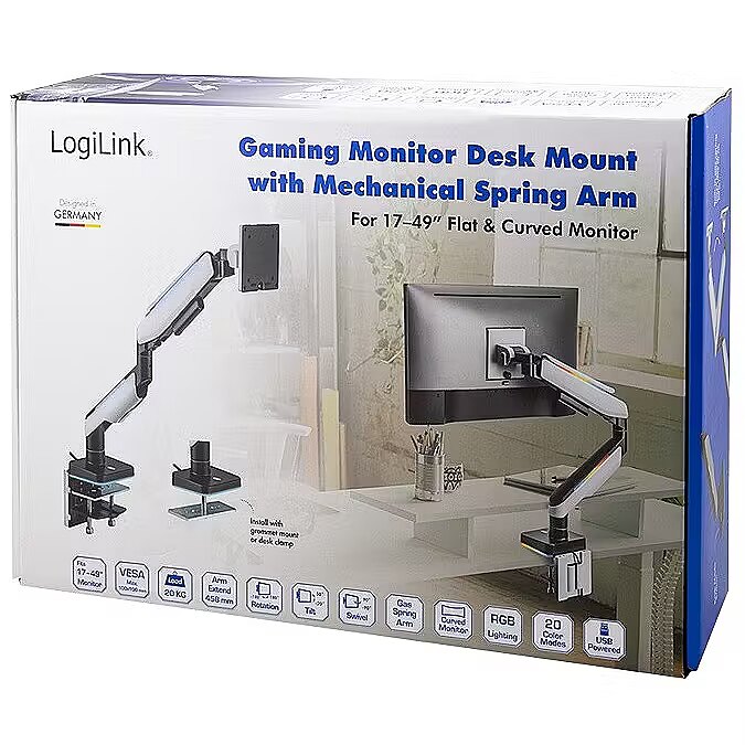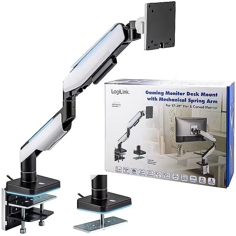 Description - Attach your monitor directly to your desk with the LogiLink gaming monitor mount. This allows you to use your screen with full freedom of movement and tilt, swivel or rotate it as you wish. The BP0162 also includes a built-in lighting effect that integrates seamlessly into any gaming station. The mount provides you with a great viewing experience while playing games and creates more space on the desk for other gaming accessories.