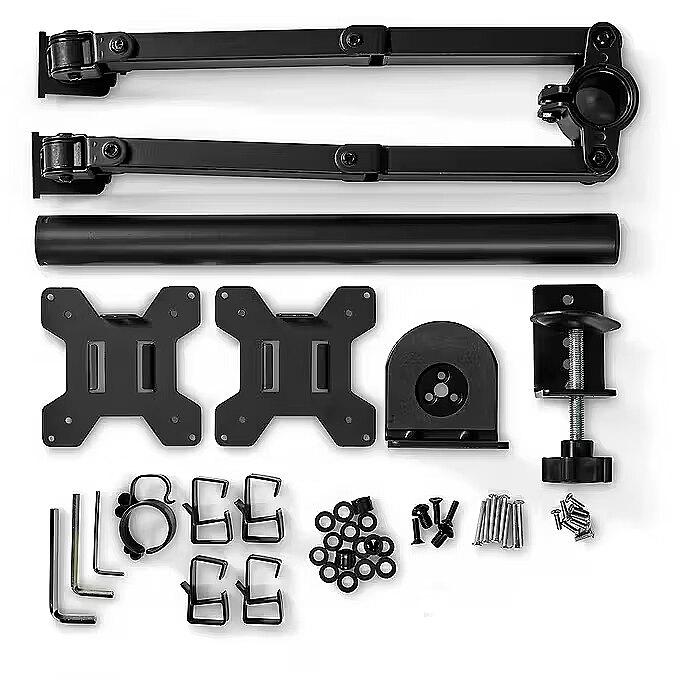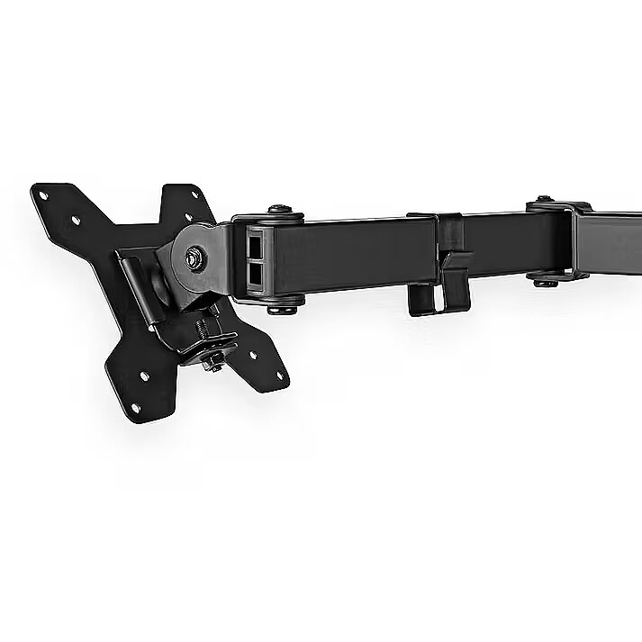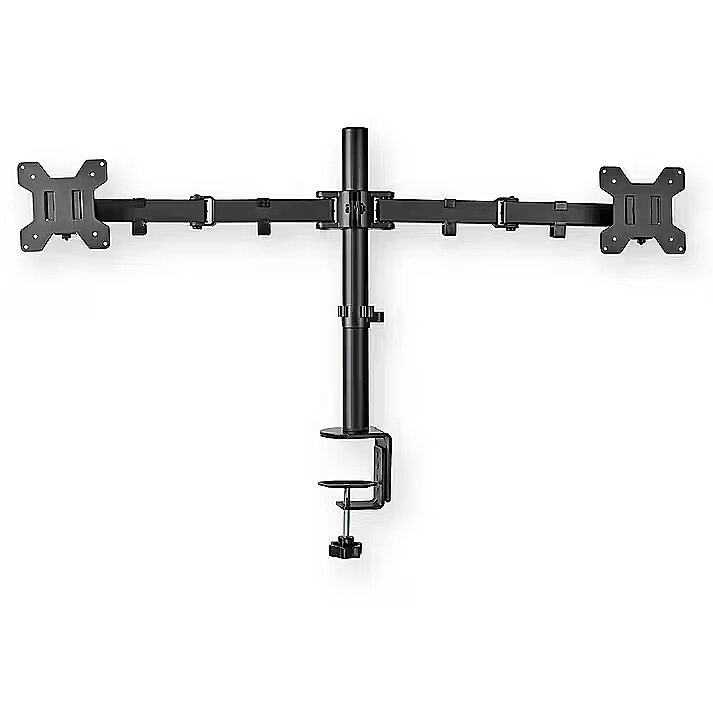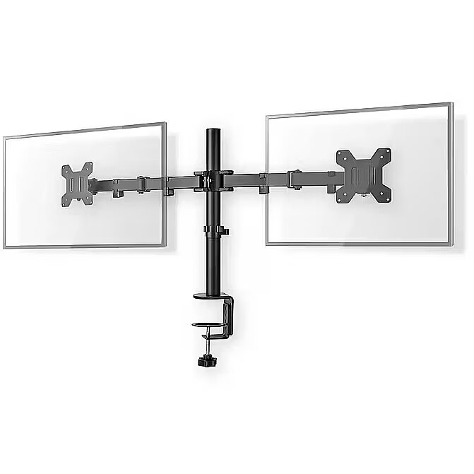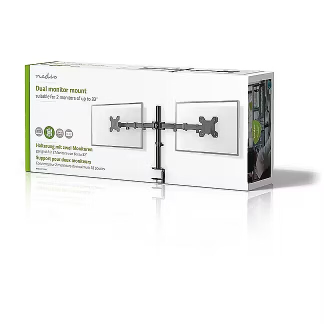 description_en - This Nedis monitor desktop mounting arm is suitable for two flat screens up to 32". The versatile tilt (50°), swivel (360°) and swivel (180°) options allow you to adjust the mount to any viewing angle. This holder is a great choice for space-saving placement on desks using a table clamp for quick and easy installation. The multi-purpose screen holder keeps your desk or gaming station tidy in any (home) office, thanks to, among other things, smart cable management clips that ensure cables are routed in an orderly manner. This screen stand is suitable for any flat (curved) screen with a VESA standard of 75x75 or 100x100 mm. Features: - Monitor holder for mounting two 32-inch screens on a table / rose table