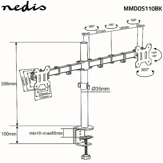 title_ru - Nedis MMDOS110BK Galda monitora stiprinājums ar pilnu kustību 15–32" / 8kg / VESA 75x75 / 100x100