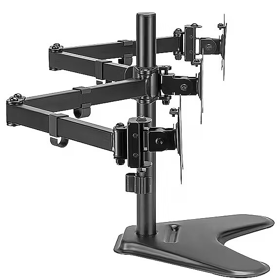 Description - Our durable and versatile monitor holder for three screens is designed to optimize your workspace, it securely holds three monitors, reducing clutter and increasing productivity. Easily adjust the height, tilt, and rotation for a customized viewing experience. The sturdy construction ensures stability, while the sleek design adds a modern touch to your desk. Say goodbye to neck strain and hello to effortless multitasking. Upgrade your setup with our monitor holder for three monitors.