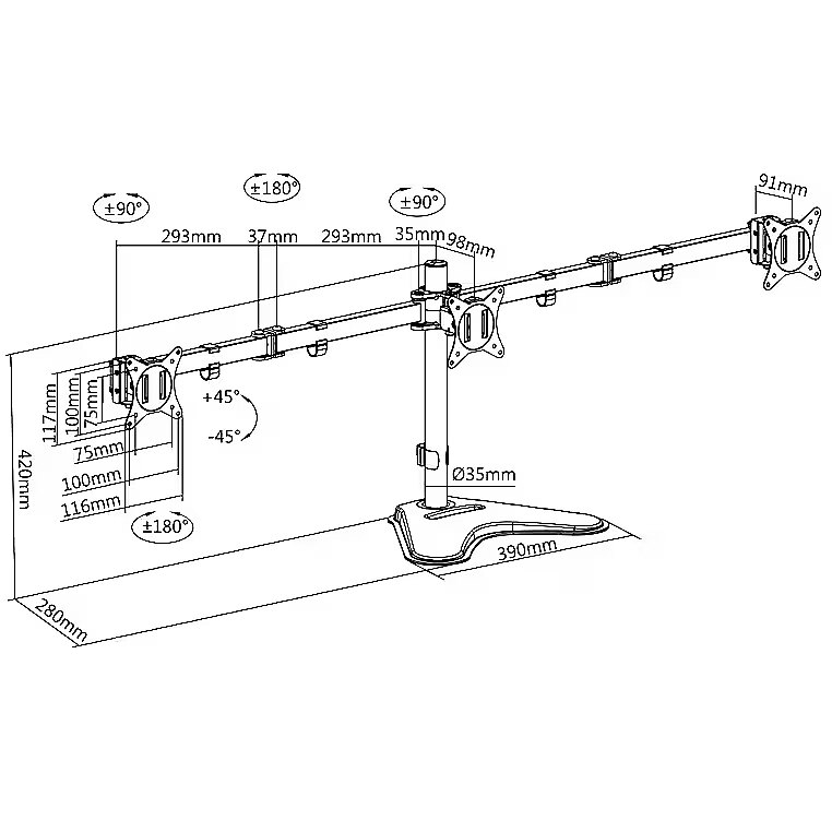 Other features - Mounting type: Free-standing with integrated smartphone holder in the base plate Weight capacity: 7 kg max. each arm Dimensions front panel WxH: 116x117 mm Pole height: 420 mm, pole diameter: 35 mm Dimensions base plate WxD: 390x280 mm Cable management: Elegantly hides all cables connected to the monitor