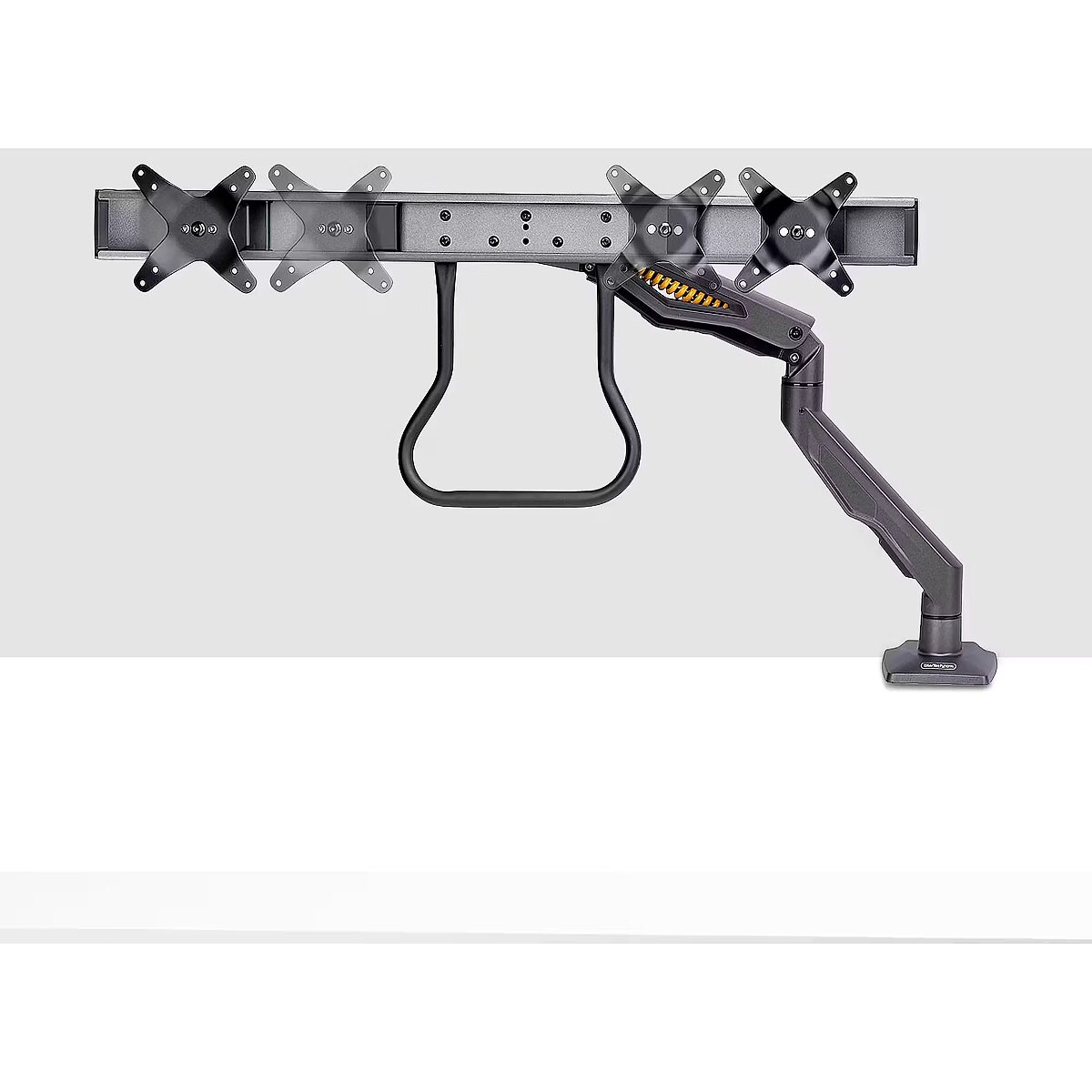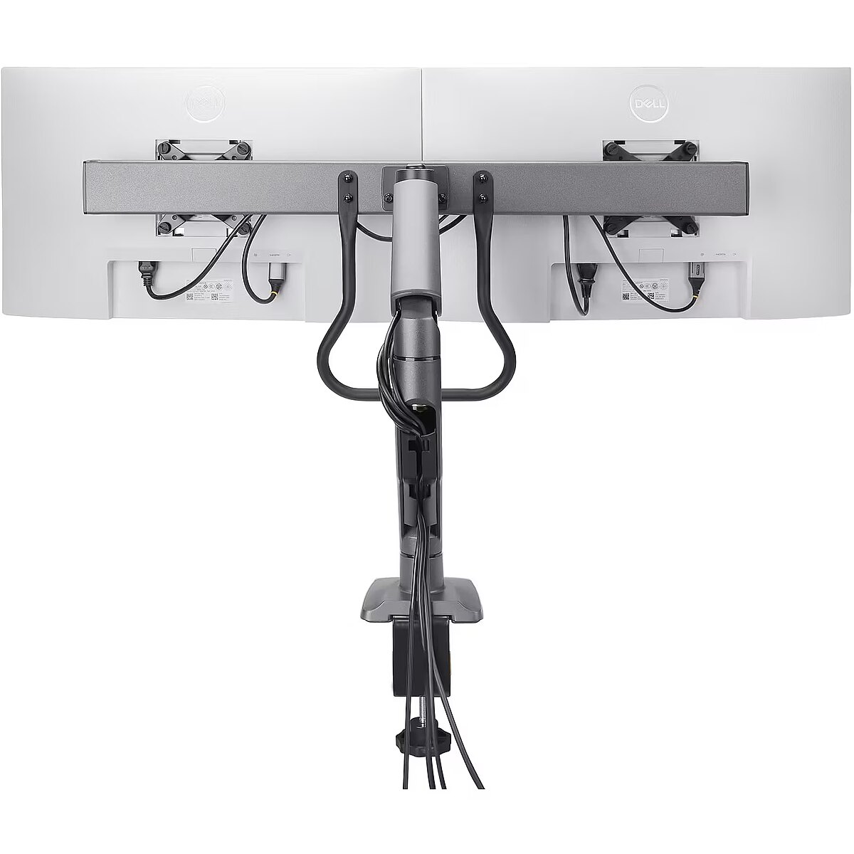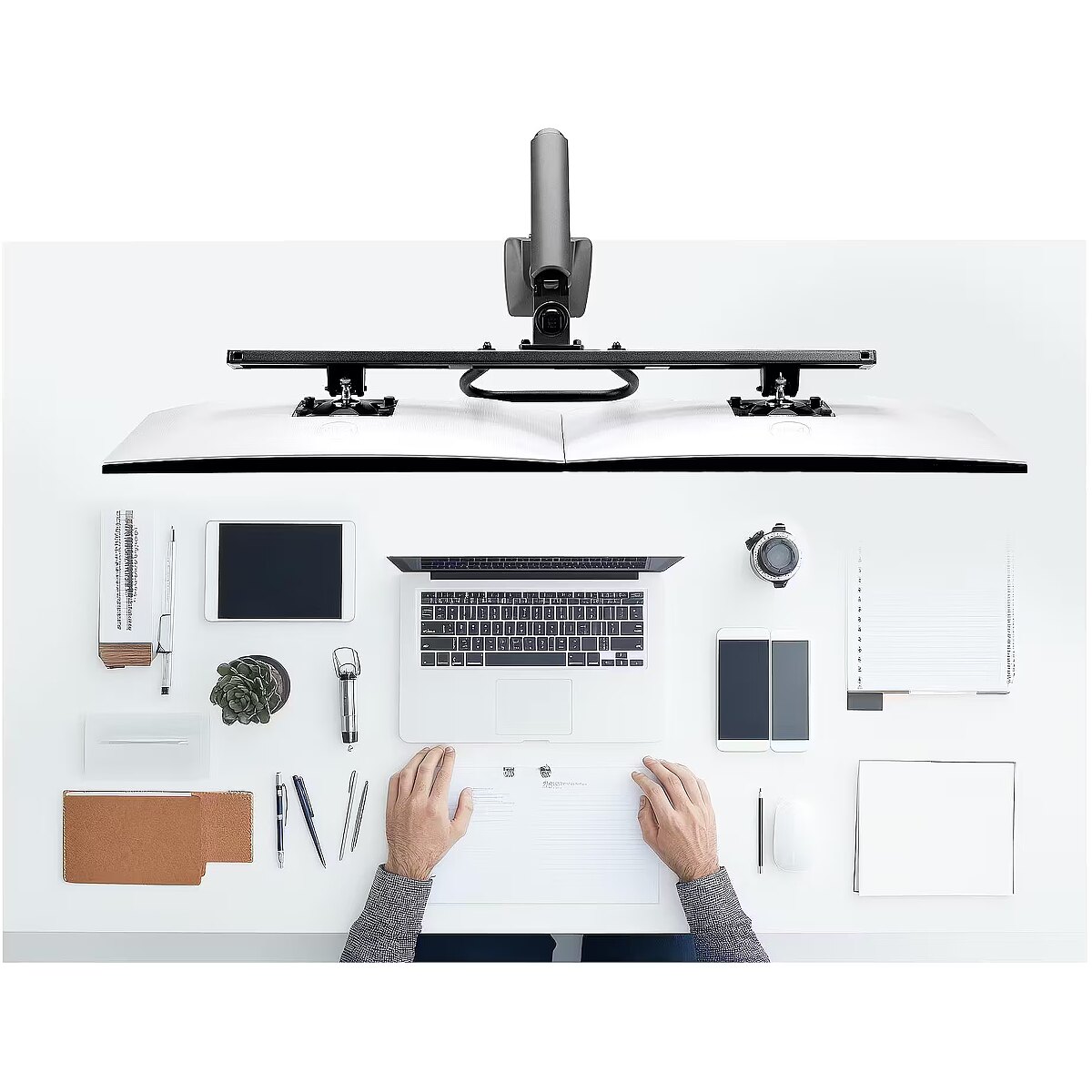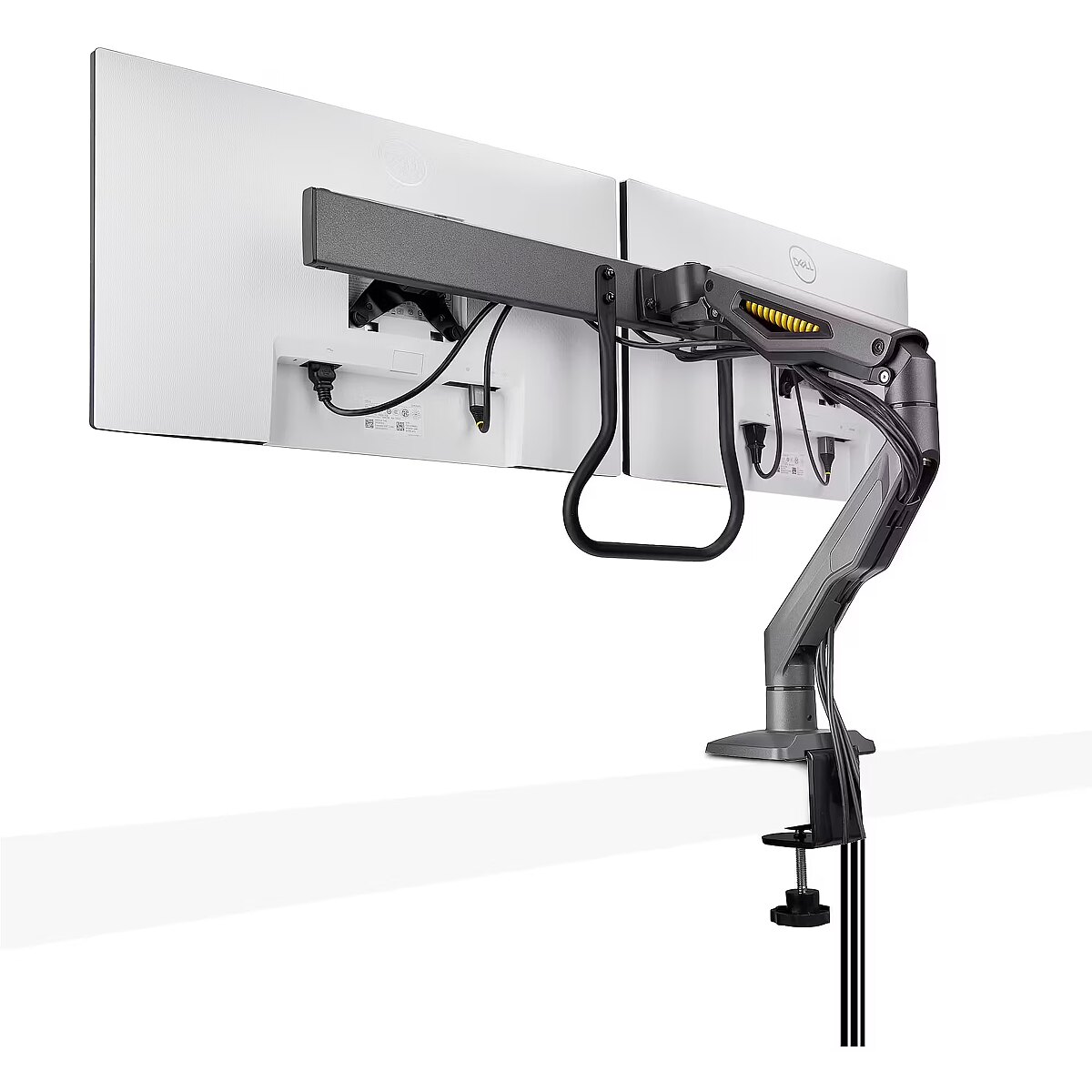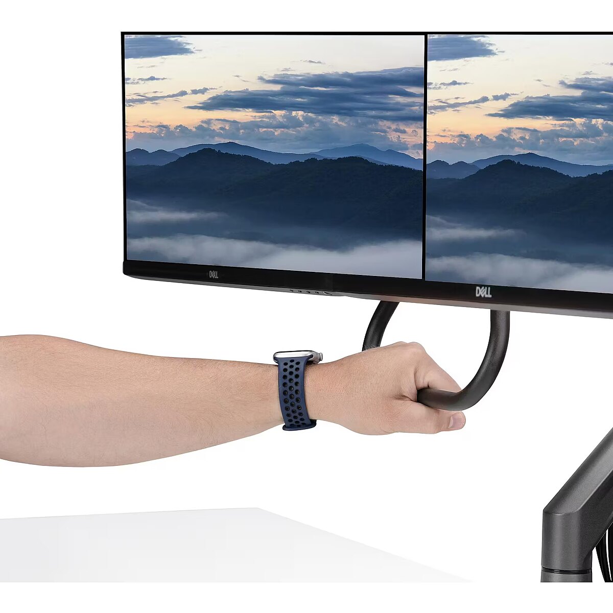 LongDesc - Dual monitor desk mount with support for up to 27" monitors with height adjustable spring armThis crossbar monitor desk mount is designed to support up to two 27-inch displays, creating an ergonomic multi-monitor setup that provides an extensive viewing area for productivity. The built-in handle enables moving all monitors simultaneously, while the spring-assisted arm enables multiple adjustments to suit different ergonomic needs.Height Adjustment with One Smooth MotionThe mechanical spring arm enables toolless height adjustment of up to 12.9in (32.7cm) with effortless one-touch motion. The maximum arm extension is 22.6in (57.4cm) and a total weigh capacity of 33lb (15kg).Visual ExperienceThis monitor mount is ideal for bezel-less or slim bezel displays, creating a more extensive and seamless viewing experience that enhances multitasking and productivity. The VESA mounts can slide along the crossbar, allowing for further adjustments.Range of MotionThe monitors' VESA mounts enable support +/-15° swivel, +65/-15° tilt, and 360° screen rotation for portrait/landscape orientation.Cable ManagementTo maintain an organized workspace, the arms feature a cable management channel along the underside to keep cables out of sight, reducing clutter and contributing to a tidy setup.The StarTech.com Advantage