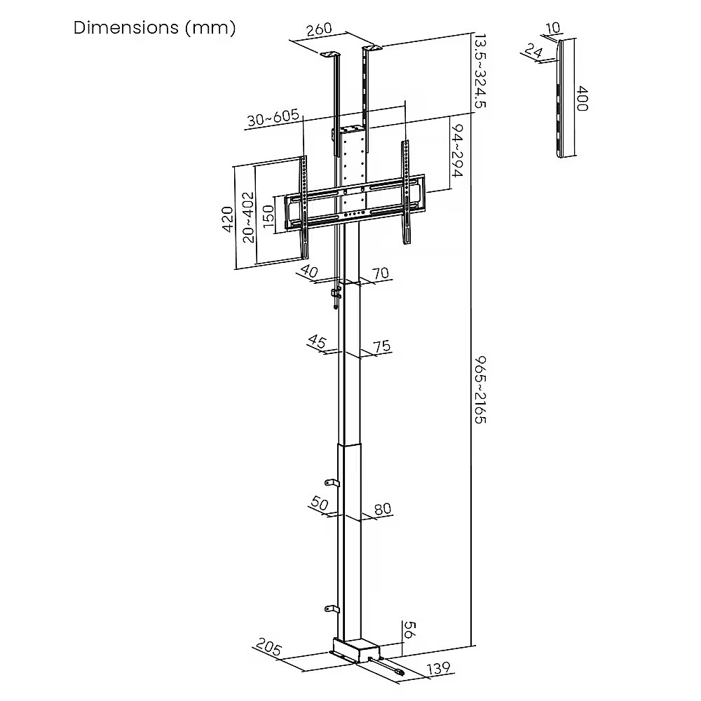 Dimensions - TV height adjustment from 965 - 2165 mm Stand height: 978.5 - 2489.5 mm Maximum load: 60 kg Designed for TVs with screen diagonal: from 43 to 88" Profile: 115 mm Length of power cable: 1,50 m Base dimensions: 205x139 mm