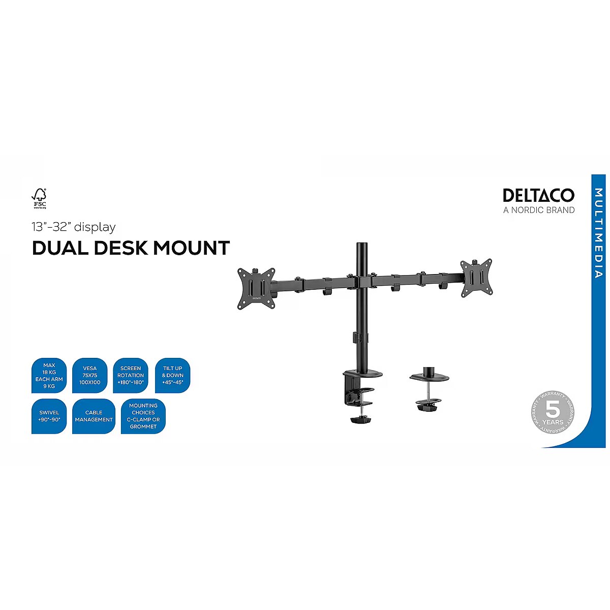 MediumDescription EN - The DELTACO Dual Desk Mount supports two 13–32″ monitors at once and helps create an ergonomic workspace. Its flexible construction allows tilting, swivelling and rotating, while cable management keeps your setup tidy. Both a desk clamp and grommet mounting solution are included.
