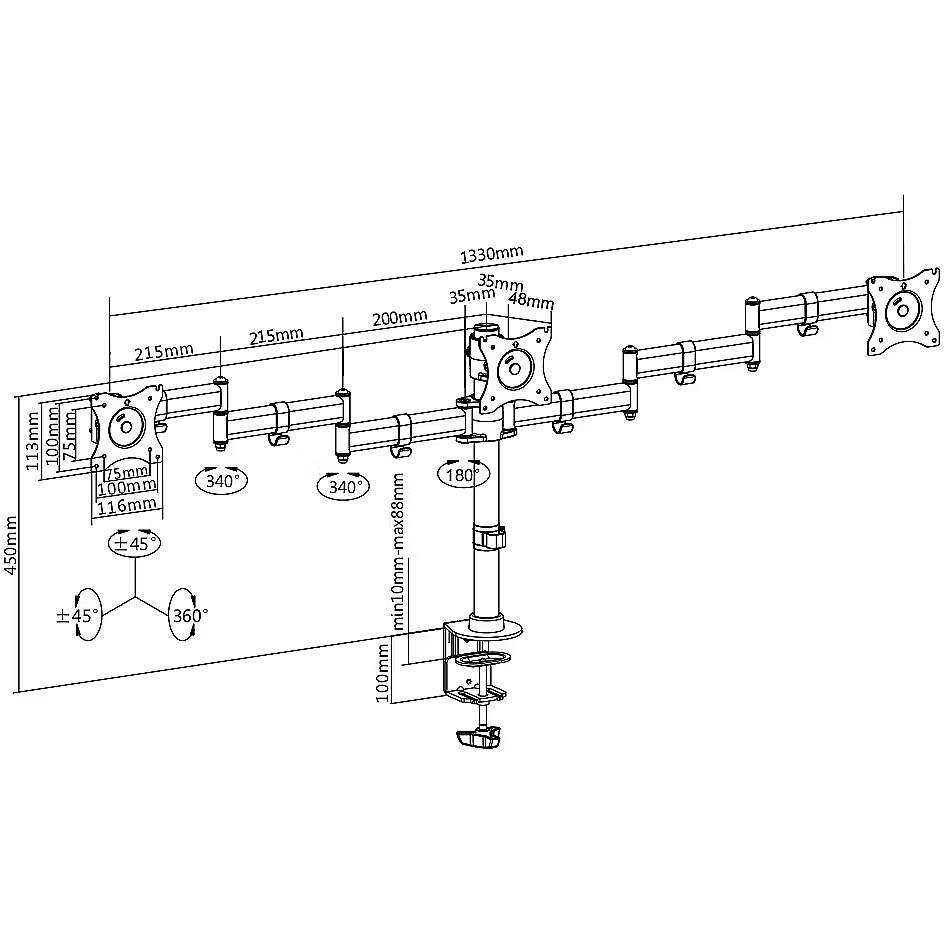 • +45°/−45° tilt, +90°/−90° swivel, 360° rotation
