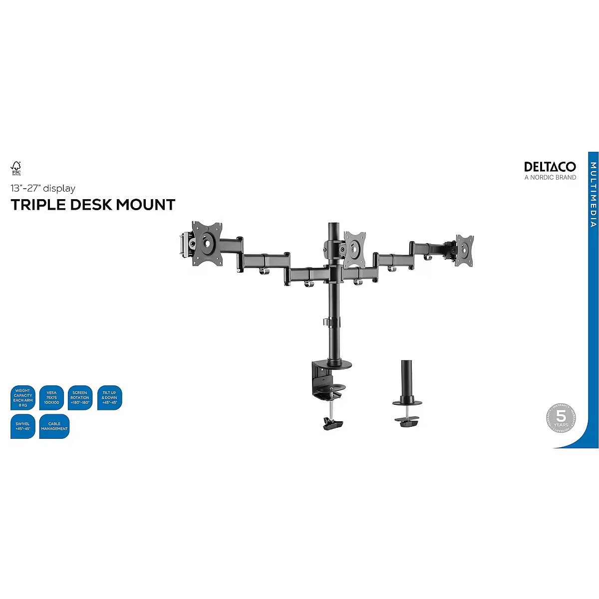 MediumDescription EN - DELTACO Triple Desk Mount keeps three 13–27″ monitors secure while creating a clean, ergonomic workspace. The flexible construction allows tilting, swivelling and rotation; installation is possible with either a desk clamp or grommet mount, and cable routing stays tidy.