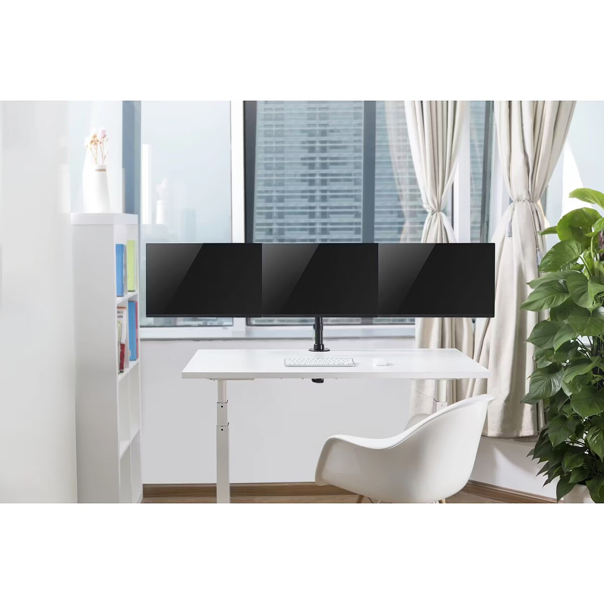 Fits three 13–27″ monitors with a load capacity of 7 kg per screen. Distribute windows and workflows across three displays without wobbling or sagging.