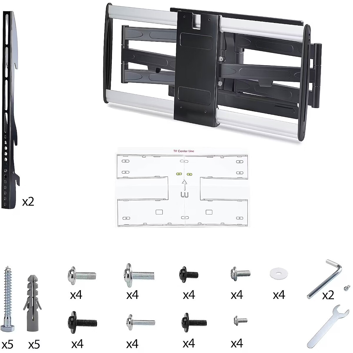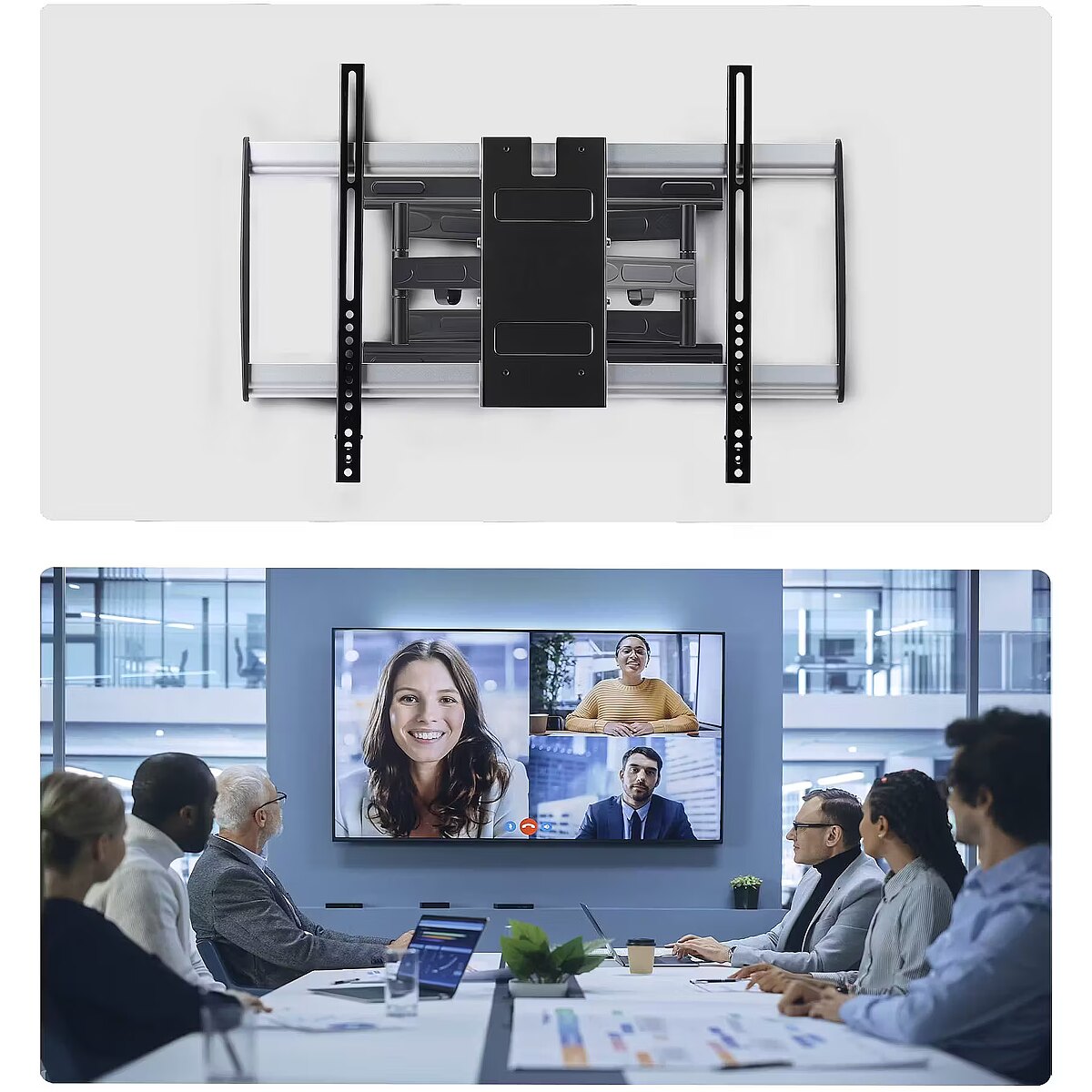 LongDesc - Mount a TV to a wall using this space-saving, low-profile mount with premium finishCreate a TV mounting solution with this articulating wall mount that supports up to 65-inch televisions and 99lb (45kg). Use in conference rooms, customer-facing applications, and collaborative spaces where durability, precision, and presentation matter.Ultra‑slim Articulating Television MountMount sits just 1.5in (4cm) from the wall for a sleek, unobtrusive look and extends to a maximum of 23.6in (60cm) when needed. For perfect screen positioning, you can tilt (+2°/-12°); swivel (+/-60°); and rotate (+/-2°) the display. The dual articulating arms and wider wall plate (16in North America spacing) provide smooth motion and stability during adjustments.Versatile Mounting with a Premium FinishThis VESA-compatible wall mount supports patterns up to 600x400mm and includes hardware, spacers, and a wall template for clean installation. It secures to wood studs, brick, or concrete surfaces, offering flexibility across environments. Integrated cable channels keep wires organized, while the silver steel and aluminum frame with decorative covers creates a refined, professional look from any angle.