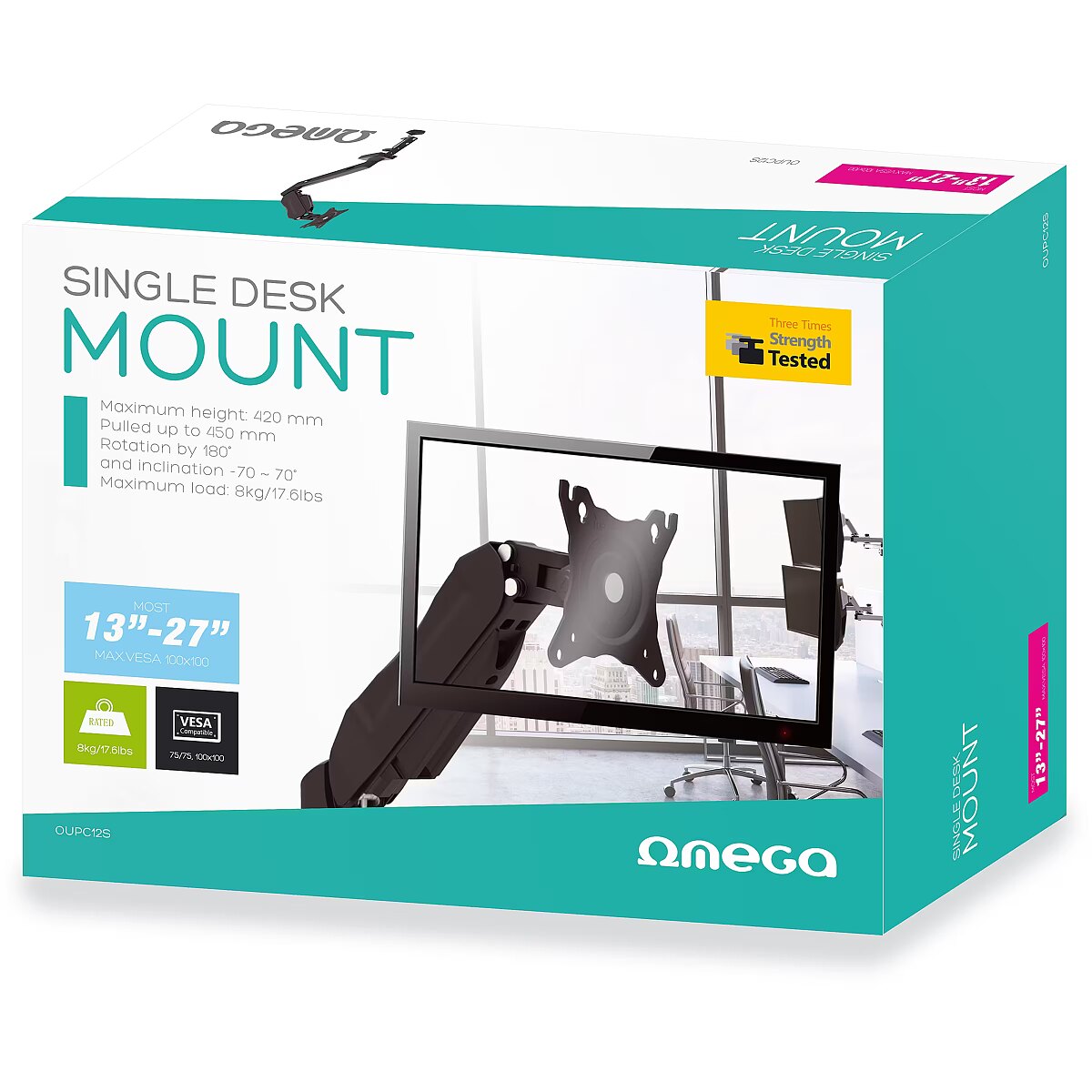 description_en - Monitor arm OMEGA OUPC12S monitor arm is an aesthetic solution that saves space, maintains the order and principles of ergonomics. The user can freely adjust the position of the monitor in the range of 180 degrees. The handle has been made of high quality material, making it very stable and durable. For attaching TFT/LCD/LED monitor with screen diagonal from 13-27" Compatible with VESA standard screens: 75 × 75, 100 × 100 Integrated cable management Quick and trouble free installation Load: 2-6.5kg Material metal tilt: ±90° Swivel: 180° Rotation: 360°