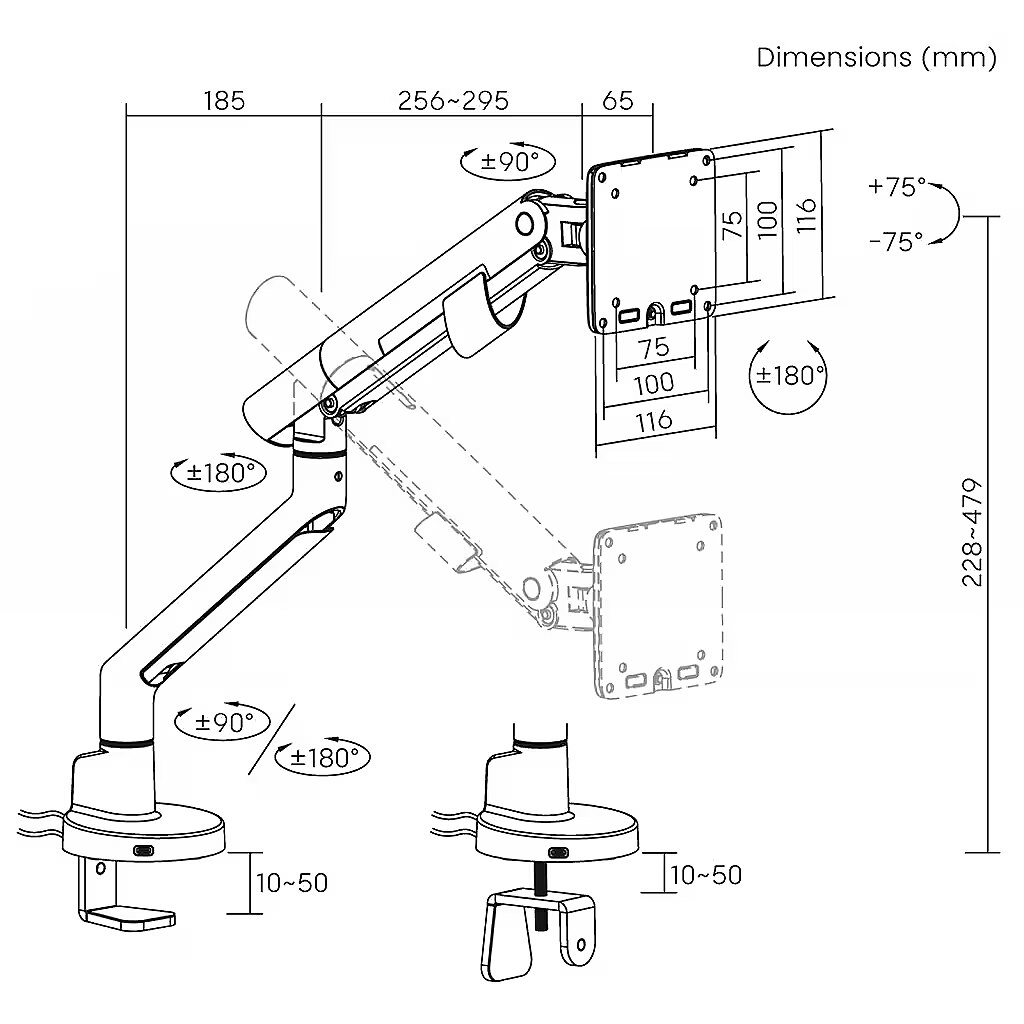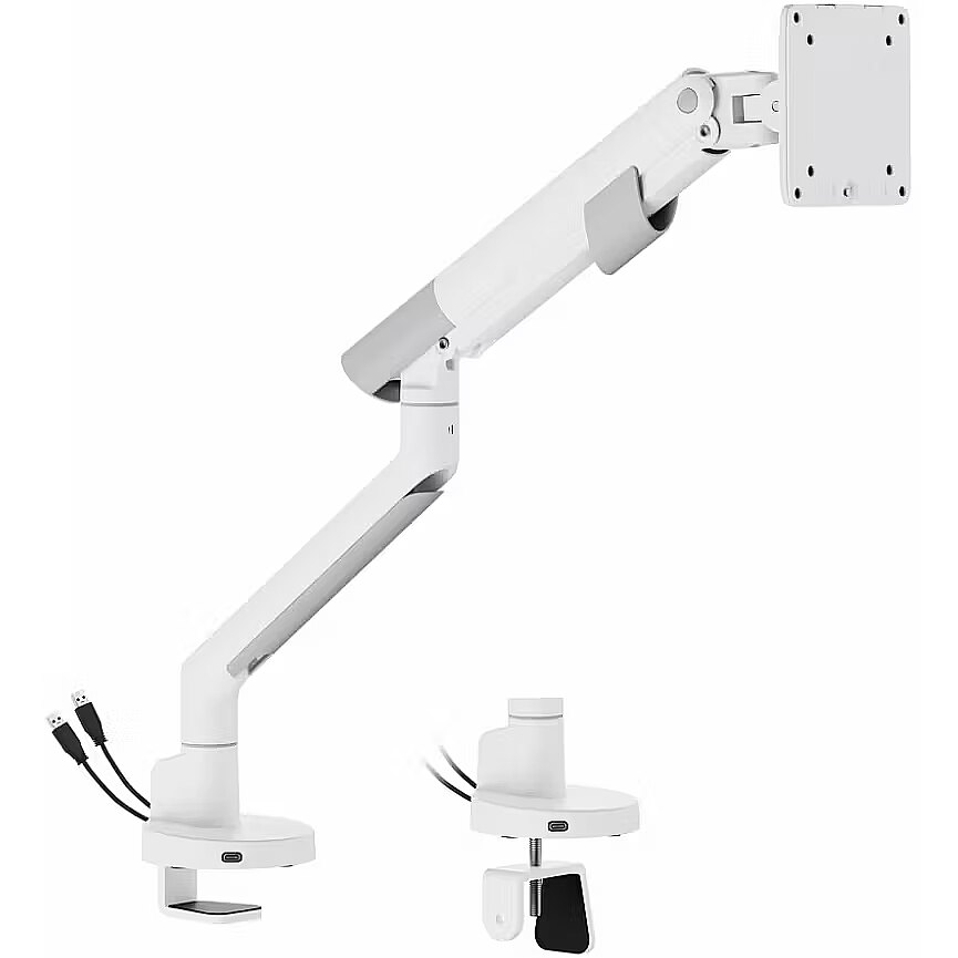 Description - Gas Desk Mount for 1 LED/LCD Monitor 17-35" L-29GD ART 2-11kg 2xUSB 3.0 PREMIUM White Maximum mounting hole spacing: 100x100 Vertical adjustment (tilt): -75 to 75 degrees Monitor rotation system: -180° +180°, allows for horizontal or vertical positioning Dual mounting options: both on the edge of a tabletop and in a hole Cable management system: yes Anti-slip lock: yes