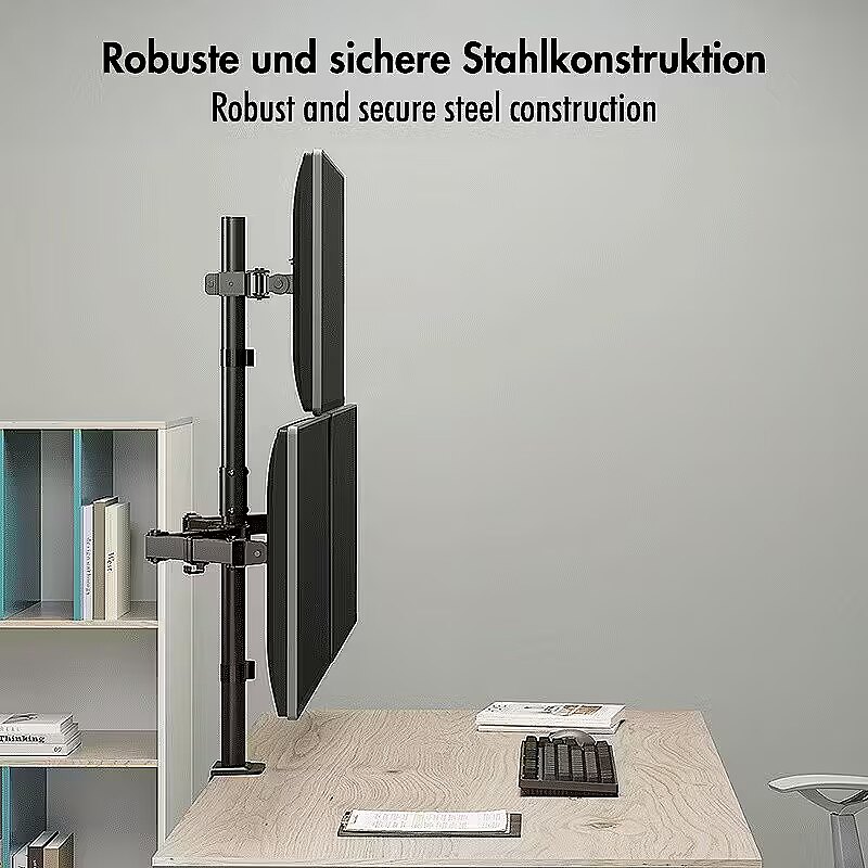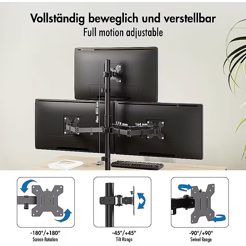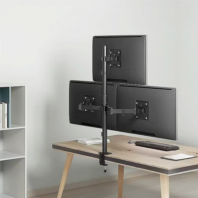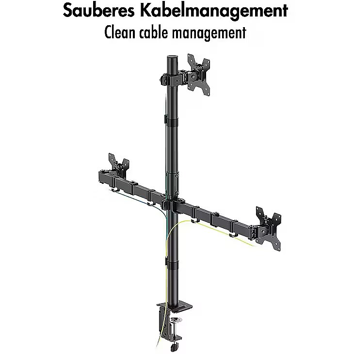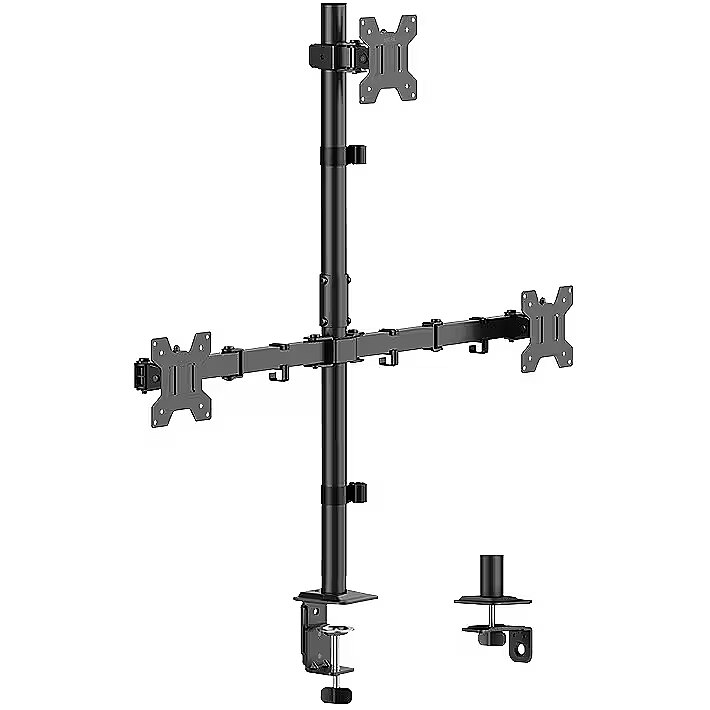 Description - Our sturdy and versatile triple monitor mount is designed to optimise your workspace. It securely holds three monitors, reduces clutter and increases productivity. Height, tilt and rotation can be easily adjusted for a personalised viewing experience. The sturdy construction ensures stability, while the sleek design adds a modern touch to your desk. Say goodbye to neck strain and look forward to effortless multitasking. Enhance your setup with our monitor mount for three monitors.