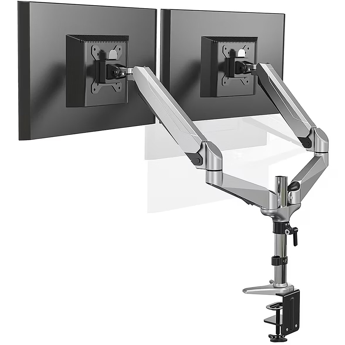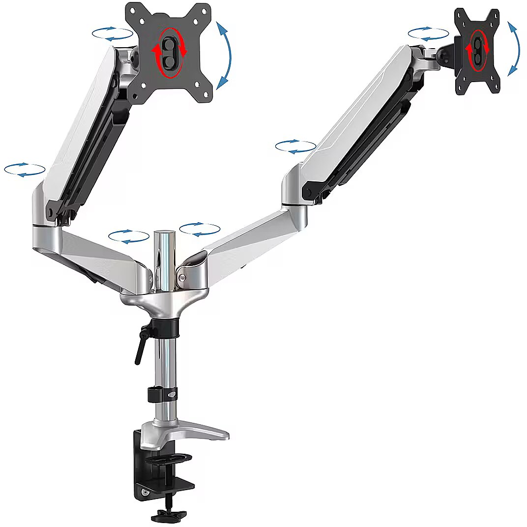 Description - The arm with a gas spring and mounting to a desk or table top that allows the installation of two monitors or TV sets.