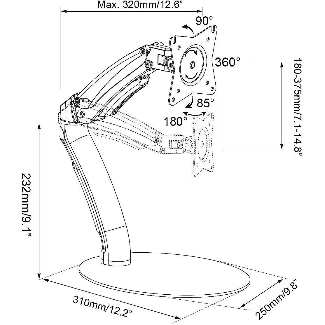 Description - Universal table stand for mounting LED and LCD monitors of all brands up to 69 cm (27") diagonal screen, thanks to the gas spring arm, you can mount the monitor at any height You only need to pay attention to the VESA dimension and the monitor weight to select the right handle to the monitor. Suitable for all LED/LCD monitors with the possibility of mounting in accordance with the VESA standard For mounting on the table devices with a diagonal screen size of 43 cm (17") to 69 cm (27") Free rotation adjustment up to 180° Free adjustment of the vertical tilt angle up to 90 degrees Free height adjustment The monitor can be rotated 180°