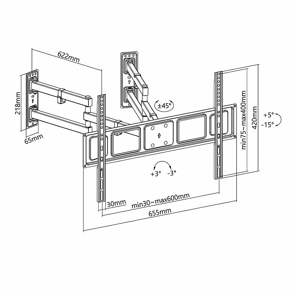 Description - The AR-85 holder is designed for LED/LCD TV 32-70" sets with vertical and horizontal adjustment; corner 622mm - mounting the handle on 2 independent arms - possibility of mounting on different walls - handle dedicated to large TVs, Vesa 600x400 - additional adjustment from -3 to 3 levels of TV level - the handle has a lock to prevent the TV from slipping - vertical adjustment -15 to 5 degrees - horizontal adjustemnt -45 to 45 degrees - application: corner mounting