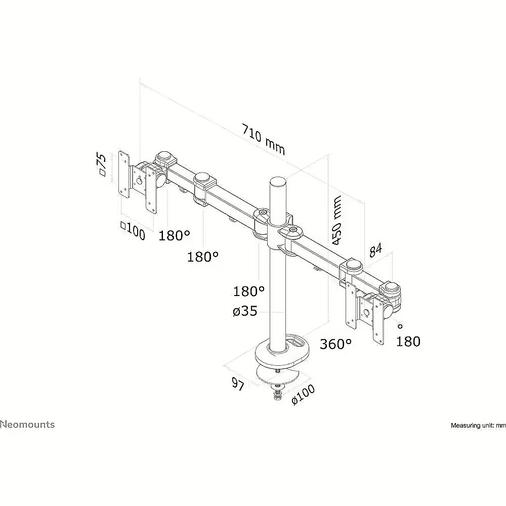 LongDesc - The Neomounts desk mount, model FPMA-D960DG is a tilt-, swivel and rotatable desk mount for 2 flat screens up to 27". This mount is a great choice for space saving placement on desks using a grommet mount.Neomounts versatile tilt (180°), rotate (360°) and swivel (180°) technology allows the mount to change to any viewing angle to fully benefit from the capabilities of the flat screen. The mount is manually height adjustable from 0 to 45 centimetres. Depth adjustable from 10 to 43 centimetres. An innovative cable management conceals and routes cables from mount to flat screen. Hide your cables to keep the workplace nice and tidy.Neomounts FPMA-D960DG has three pivot points and is suitable for screens up to 27" (69 cm). The weight capacity of this product is 8 kg each screen. The desk mount is suitable for screens that meet VESA hole pattern 75x75 or 100x100mm. Different hole patterns can be covered using Neomounts VESA adapter plates.For curved monitor screens we recommend our FPMA-D960 PLUS models; our FPMA-D960DVBLACKPLUS is suitable for screens up to 49" (124 cm). The weight capacity of this product is 32 kg each screen. This monitor arm is therefore extremely suitable for widescreens and curved screens. By using an ergonomic mount neck- and back complaints can be avoided. Ideal for use in offices and on counters or in a reception area.All installation material is included with the product.