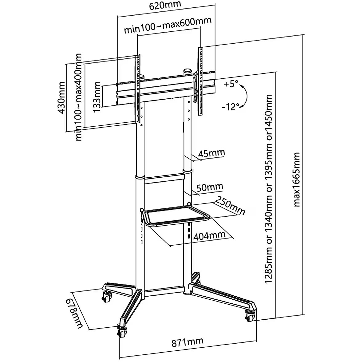Description - The compact TV trolley allows mobile use with TVs up to 70" diagonal with a maximum weight of up to 50 kg. It is suitable for televisions with a screen diagonal of 37''- 70'' with a weight of up to 50 kg and can be used in various locations such as offices, conference rooms, restaurants, hospitals, etc. Four possible height settings for the mounting plate allow adjustment to the desired height. The tool-free tilt adjustment provides the optimum angle for viewing the screen. Thanks to the (two) castors with locking function in position, the TV trolley can be easily moved and stopped as required. The integrated cable management solution ensures a tidy appearance. Notepad, player etc. can be placed on the practical shelf. Supported monitor sizes: 37''-70'' Maximum load capacity: 50 kg Height adjustment: 4 possible positions (128.5 / 134, 139.5, 145 cm) for setting the optimal viewing position Free rotation design: easy adjustment of the forward or backward position for better visibility and reduced glare Highly loadable castors with locking mechanism: can be moved or stopped at will Cable management: keeps workspace tidy Practical shelf (40.4 x 25 cm, max. load capacity: 5 kg) for notebook, media player, etc. Compatible with VESA standard: 100 x 100, 200 x 100, 200 x 200, 300 x 200, 300 x 300, 400 x 200, 400 x 300, 400 x 400, 600 x 400 Tilt range: +5° to -12°. Surface: Powder-coated