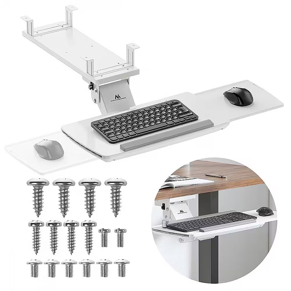 Description - Desk keyboard holder adjustable white Maclean under-desk keyboard holder, adjustable, max. 5kg, white, MC-156 W The MC-156 keyboard holder is a practical and ergonomic solution for people who value order and convenience in the workplace. Thanks to its mounting under the desk top, the holder allows efficient use of working space, while ensuring a comfortable position while typing. The construction made of solid materials ensures stability and durability, and the maximum load of up to 5 kg allows safe use of both light and heavier keyboards. The handle's functionality has been expanded to include a pull-out mouse shelf, which can be extended on both the right and left sides - making this model ideal for both right- and left-handed users. The handle also allows you to adjust the tilt of the keyboard within a range of up to 15 degrees, allowing you to perfectly adjust the working angle to suit your individual needs, thus reducing tension in your wrists and forearms.
