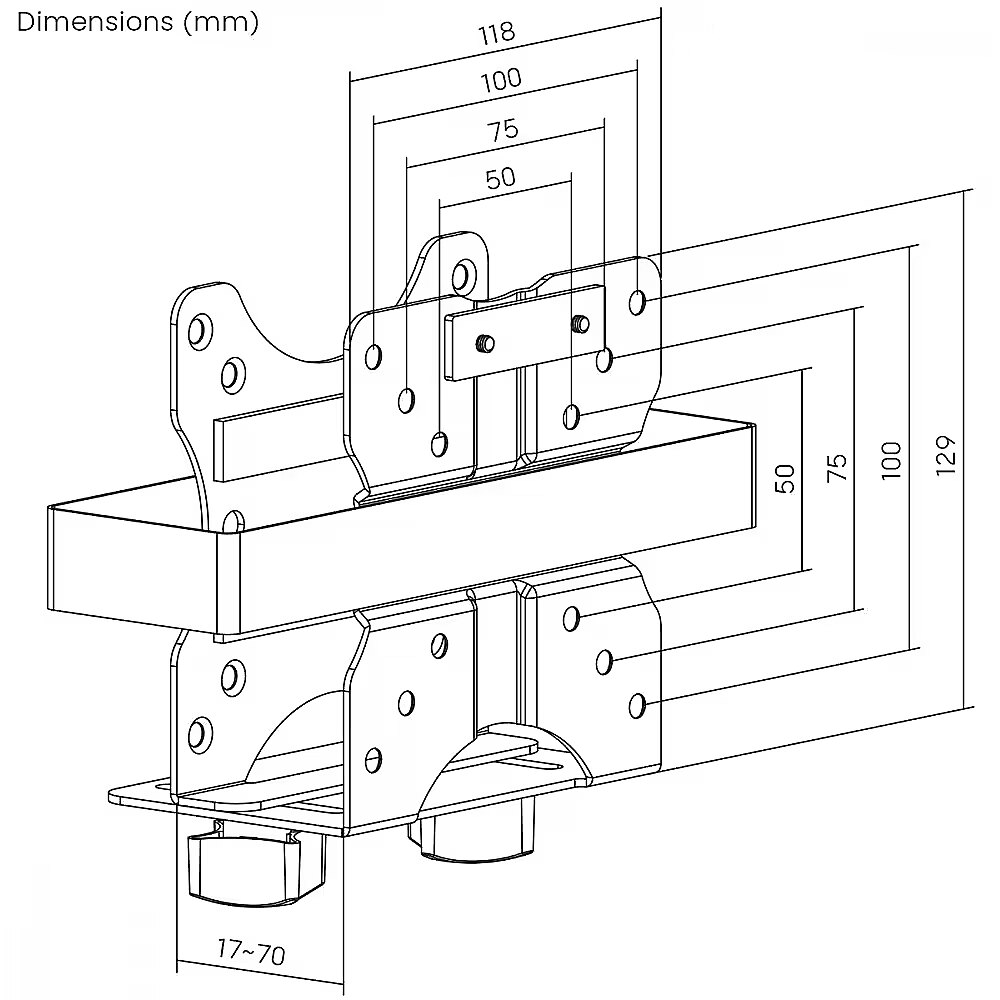 Dimensions - Adjustable depth: from 17 to 70mm Width: 50 - 75 - 100 - 118 mm Height: 50 - 75 - 100 - 129 mm
