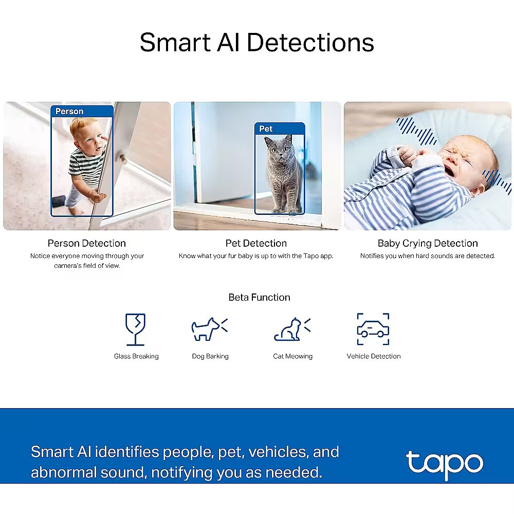 Smart AI identifies people, pets, and vehicles while recognizing a baby crying and other sounds, notifying users as needed. Motion Detection and Notifications