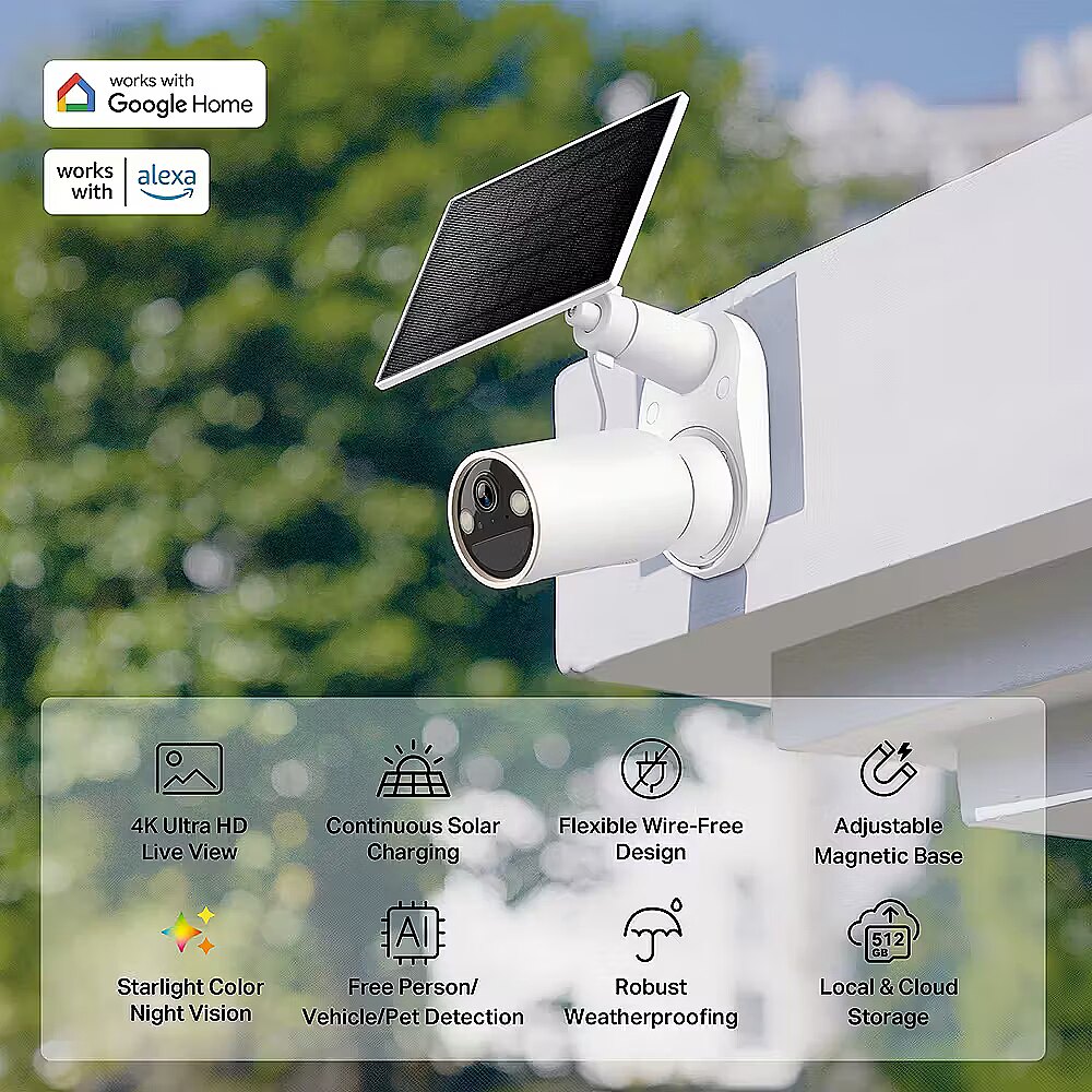 Description - TP-LINK TAPO C460 KIT Uninterrupted Power Supply: Enjoy a maintenance-free security experience with the Tapo Solar Panel, which provides a continuous power supply and flexible installation. Wire-Free, Installs Almost Anywhere: Eliminates the need for outlets and enables flexible placement. Add security to your home, wherever, whenever. 4K Ultimate Clarity: The camera features 4K 8MP resolution for superior clarity with upgraded image sensor, processor and lens. Starlight Color Night Vision: Capture vibrant images in low light. Enhance security with an F1.6 lens, starlight sensor, and spotlights. Easily Adjust to the Best Angle: Monitor from any angle with the adjustable magnetic base. Flexible Storage Options: Choose from local microSD storage up to 512GB or the secure Tapo Care cloud service for additional peace of mind. Free AI Detection: Using AI technology, the camera provides alerts as it identifies people, pets, and vehicles, reducing false alerts and unnecessary notifications. Intelligent Phone Notifications: Customize activity zones for precise motion detection and phone alerts, focusing on what truly matters.