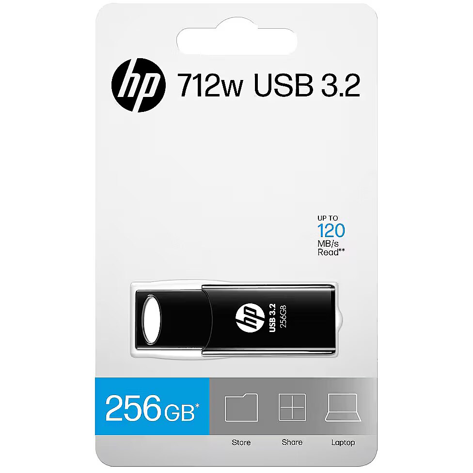 LongSummaryDescription - HP 712w. Capacity: 256 GB, Device interface: USB Type-A, USB version: 3.2 Gen 1 (3.1 Gen 1), Read speed: 120 MB/s. Form factor: Slide. Weight: 10.2 g. Product colour: Black