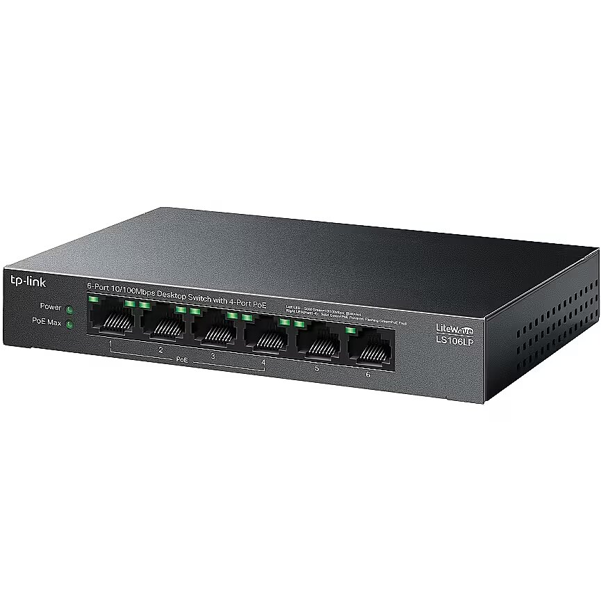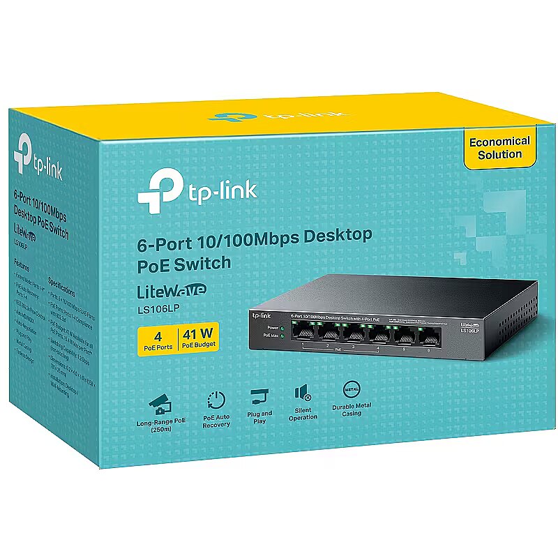 Description - LS106LP 6-Port 10/100Mbps Desktop Switch with 4-Port Po 41 W PoE Budget: Four 10/100 Mbps 802.3af-compliant PoE ports easily connect and power fixed devices like IP cameras, access points, and IP phones via a single cable. Up to 15.4 W PoE output is supported by each PoE port. Up to 250 m PoE Transmission: With Extend Mode, PoE transmission distance reaches up to 250m, perfect for surveillance camera deployment in large areas. PoE Auto Recovery: Automatically reboots your dropped or unresponsive PoE-powered devices. Plug and Play: Simply plug and play for instant connectivity with no configuration required. Silent Operation: Fanless design reduces power consumption and ensures silent operation, ideal for noise-sensitive homes or businesses. Reliable Hardware Design: Durable metal casing and desktop/wall-mounting design are well-suited for different environments.