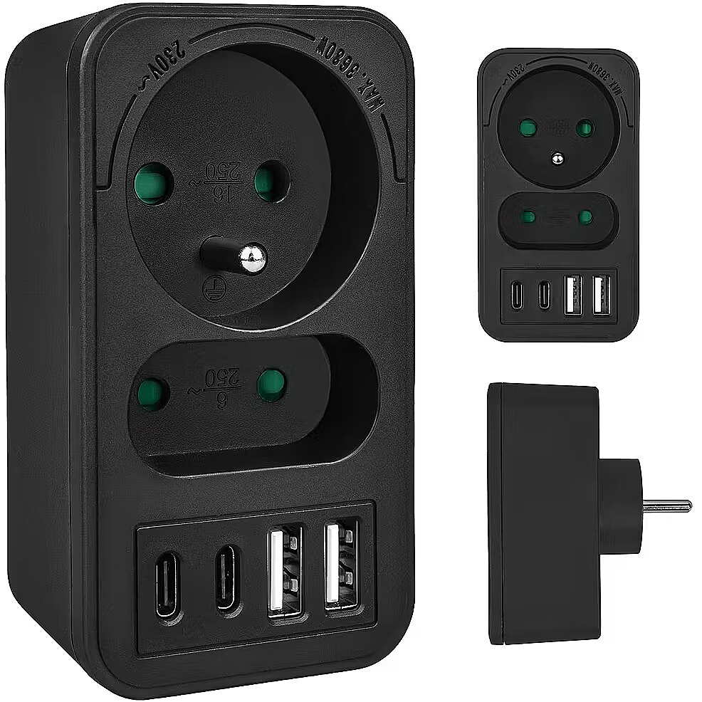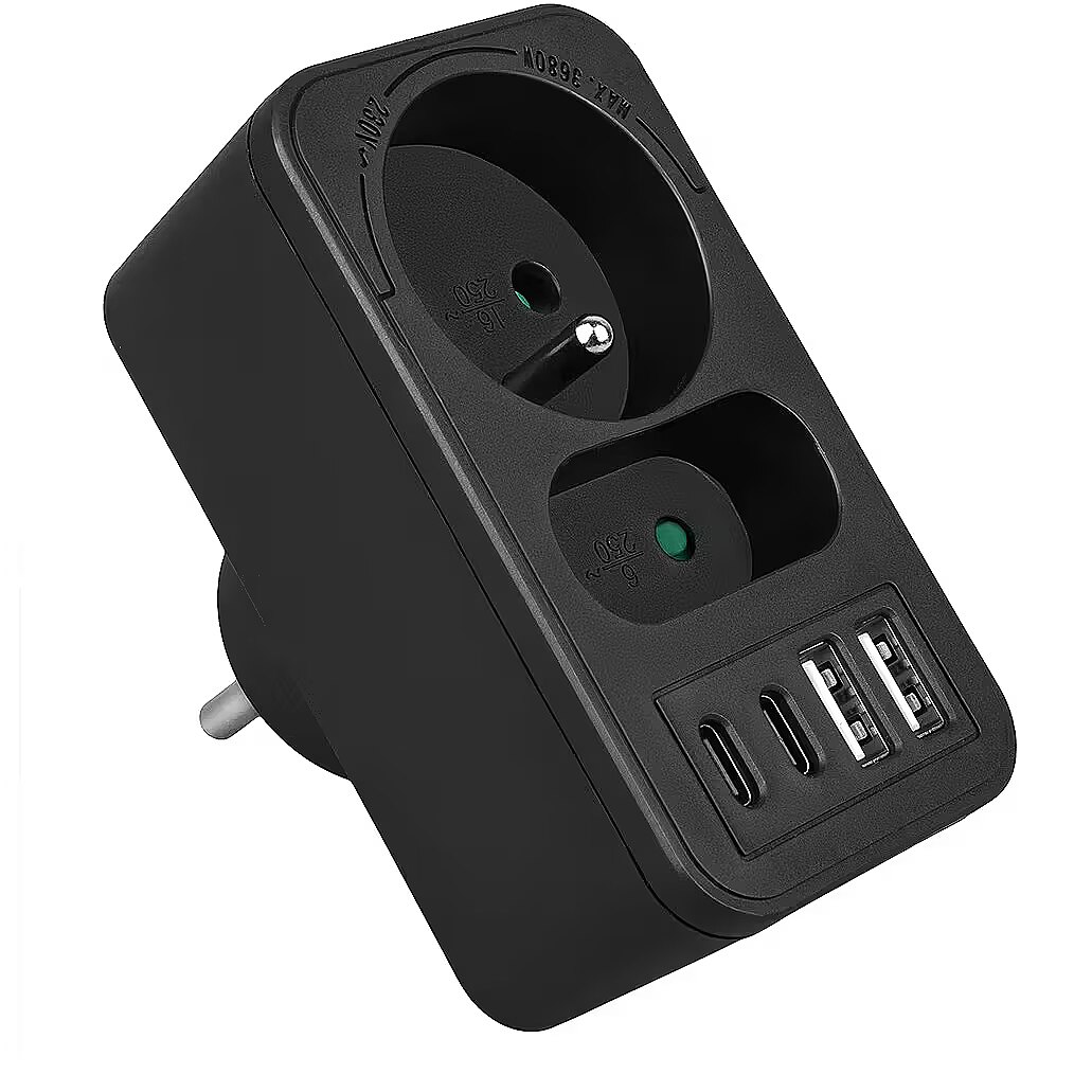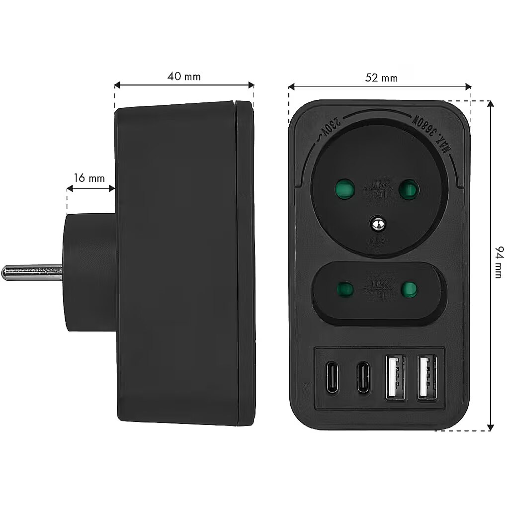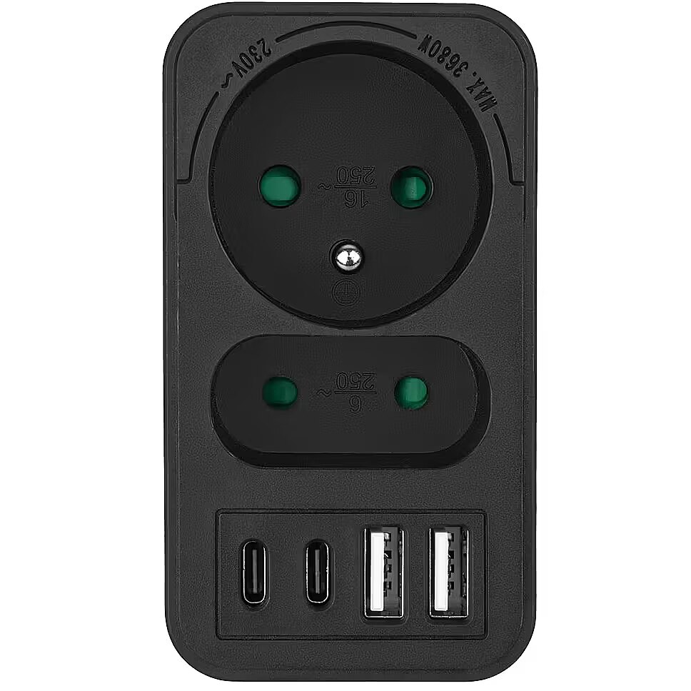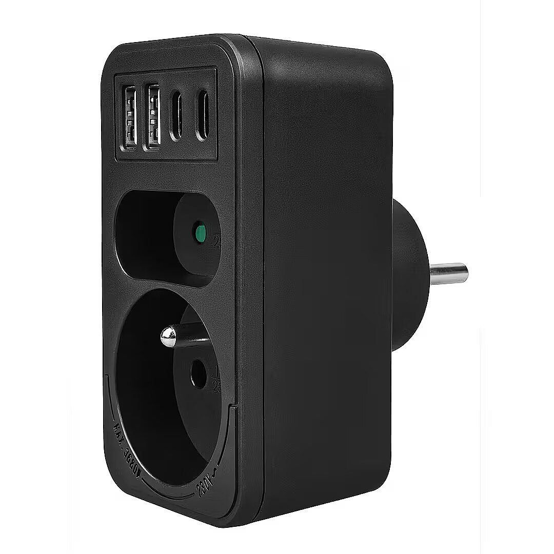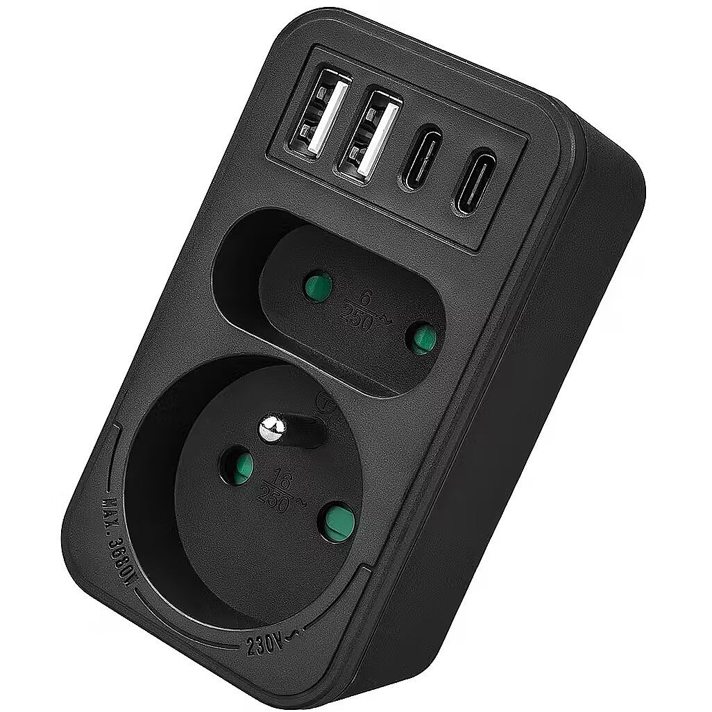 Other features - Color: black Housing material: plastic Power source (voltage): 110-240 V AC / 50/60 Hz Type of sockets: 1x flat socket (type C), 1x round socket with grounding pin (type E) Maximum load: socket C - max. current 6A 1380 W; socket E - max. current 16A 3680W USB port type: 2x USB-A, 2x USB-C USB-A output power: 5V/3A, 9V/2A, 12V/1.5A, max. 18 W (using one output) USB-C output power: 5V/3A, 9V/2.22A, 12V/1.67A, max. 20 W (using one output) Child safety feature: yes Protection rating: IP20
