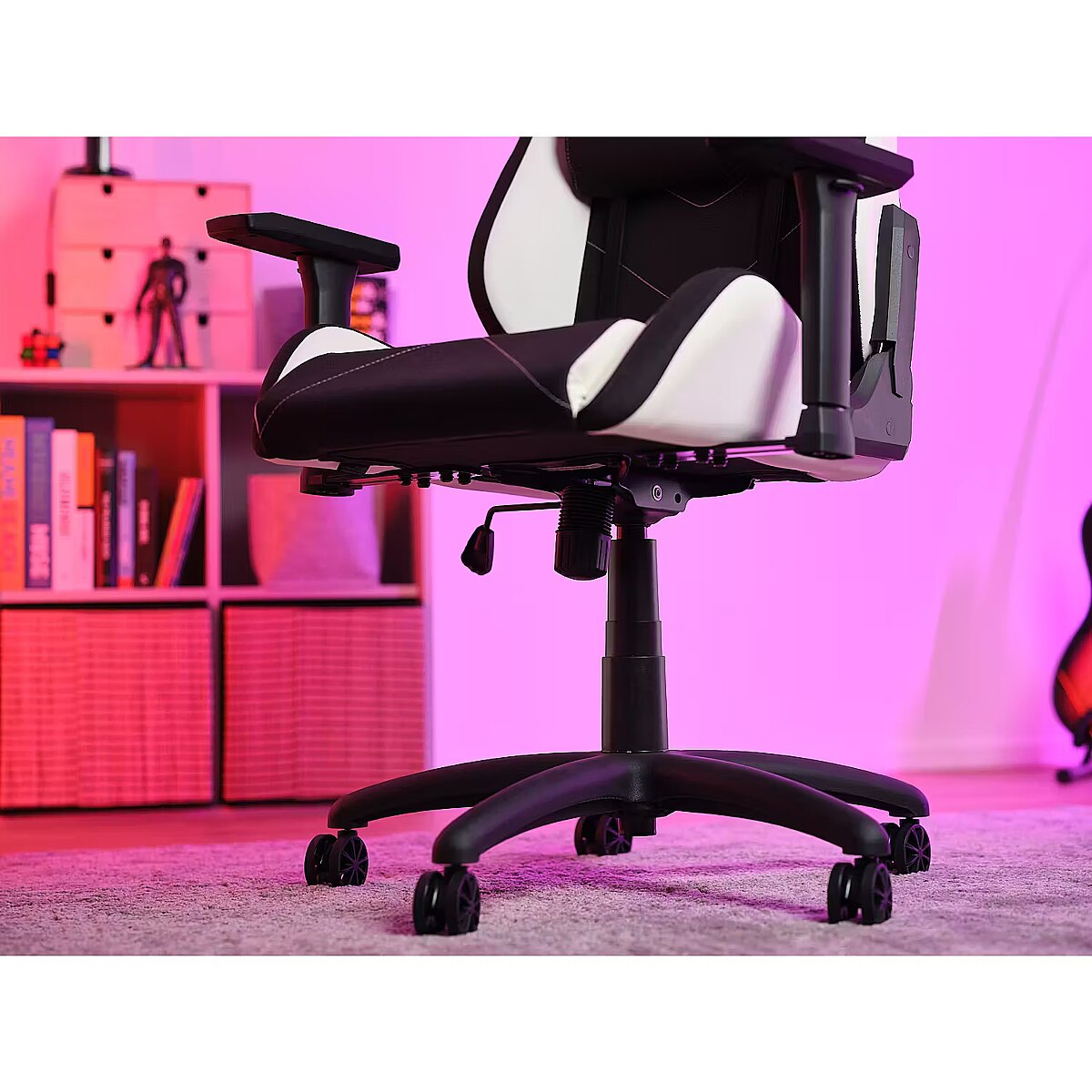 Desc - Krāsa: Melna / Balta, Materiāls: Mākslīgā āda, Konstrukcijas materiāls: Koks, Regulējami roku balsti: Ir, Regulējama atzveltne: Ir, Regulējams augstums: Ir, Regulējams slīpums: Ir, Plecu platums (mm): Nav zināms, Vidukļa platums (mm): Nav zināms, Sēdekļa platums (mm): 520, Muguras augstums (mm): 830, Sēdekļa augstums (mm): Nav zināms, Kopējais augstums (ieskaitot riteņus) (mm): 1340, Maksimālais lietotāja svars (kg): 150, Garantija: 2 gadi
