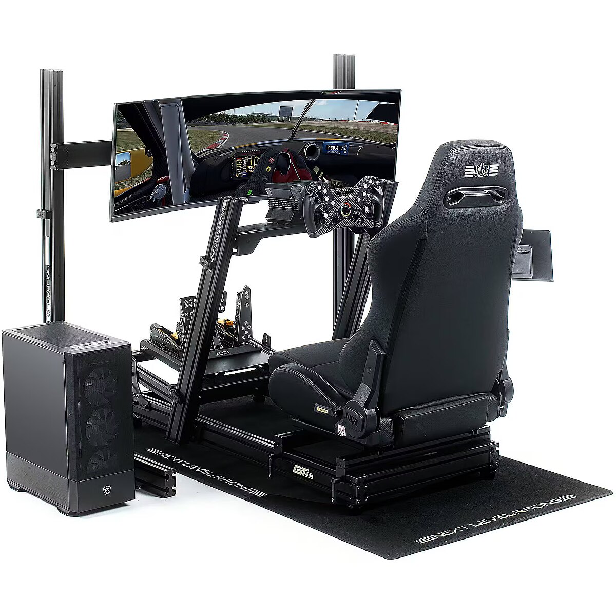 The Next Level Racing Premium XL floor mat is compatible with all current Next Level Racing cockpits, including Motion Plus, GTRacer Series, Go Kart Plus, Elite Series configurations and various Lite, F-GT and Flight Simulator models.     The non-slip backing keeps the mat securely in place during intense racing or flying sessions.     Thick premium carpet made from high quality polyester fibre for durability.     Reflective logos reflect light for a striking visual effect.     Universal fit for all Next Level Racing cockpits, adds a consistent and refined look to your setup.