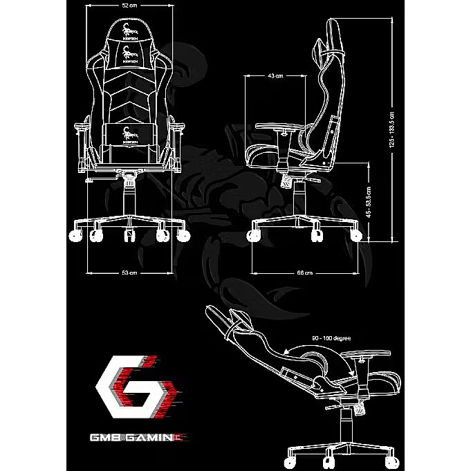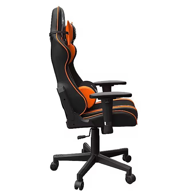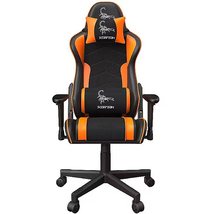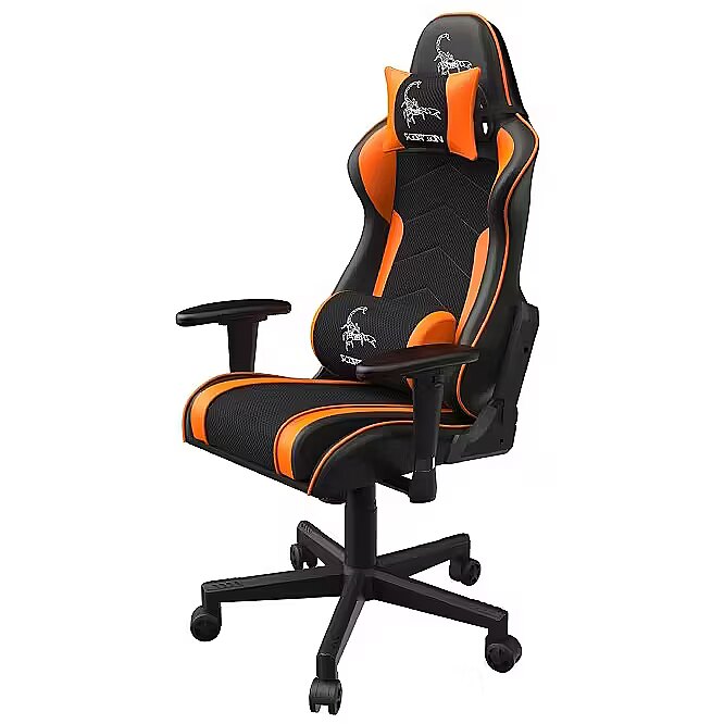 Description - Krzesło gamingowe Scorpion czarno-pomarańczowe Krzesło komputerowe z PVC Mocna nylonowa podstawa, gąbka w oparciu i zagłówku oraz formowana pianka wewnątrz siedziska Wentylowane siateczkowe siedzisko i przód Regulowany podłokietnik 2D Mechanizm uchylny, podnośnik gazowy i koła PU