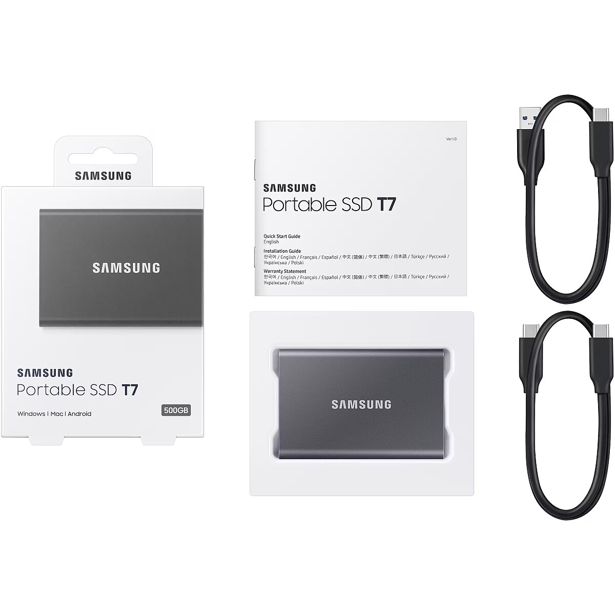 ProductDescription - Samsung SSD T7 External 500GB, USB 3.2, 1050/1000 MB/s, included USB Type C-to-C and Type C-to-A cables, 3 yrs, iron gray